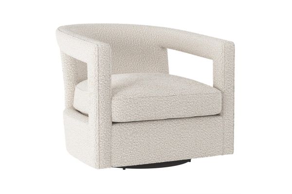 The sleek, sculptural design of the Alana swivel chair adds modern flair to an interior, blending seamlessly with contemporary and transitional styles. Two cutouts on either side are lined with welt trim for a crisp, polished look. Webbing construction and spring down cushioning provide luxurious comfort and support.