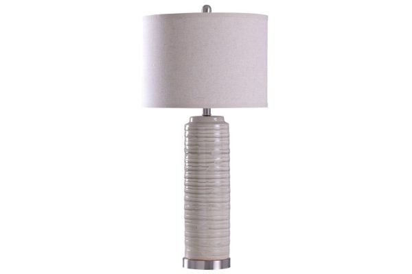 The Anastasia Table Lamp is neutral in color and has a unique fabric wrapped texture. Made with solid ceramic, this lamp is transitional in your home.
