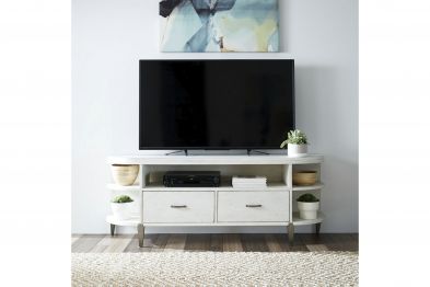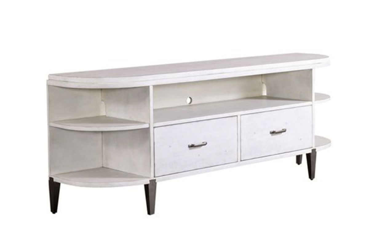 Transitional meets modern with this 68" white TV Console. Beautifully finished in a distressed white with brown accent legs, this console provides the ideal space to display your TV. This console is as functional as it is stylish with the shelving units on each side and two bottom drawers for additional storage. A must have for living areas and entertainment spaces, this 68" TV Console is ideal for your living space.