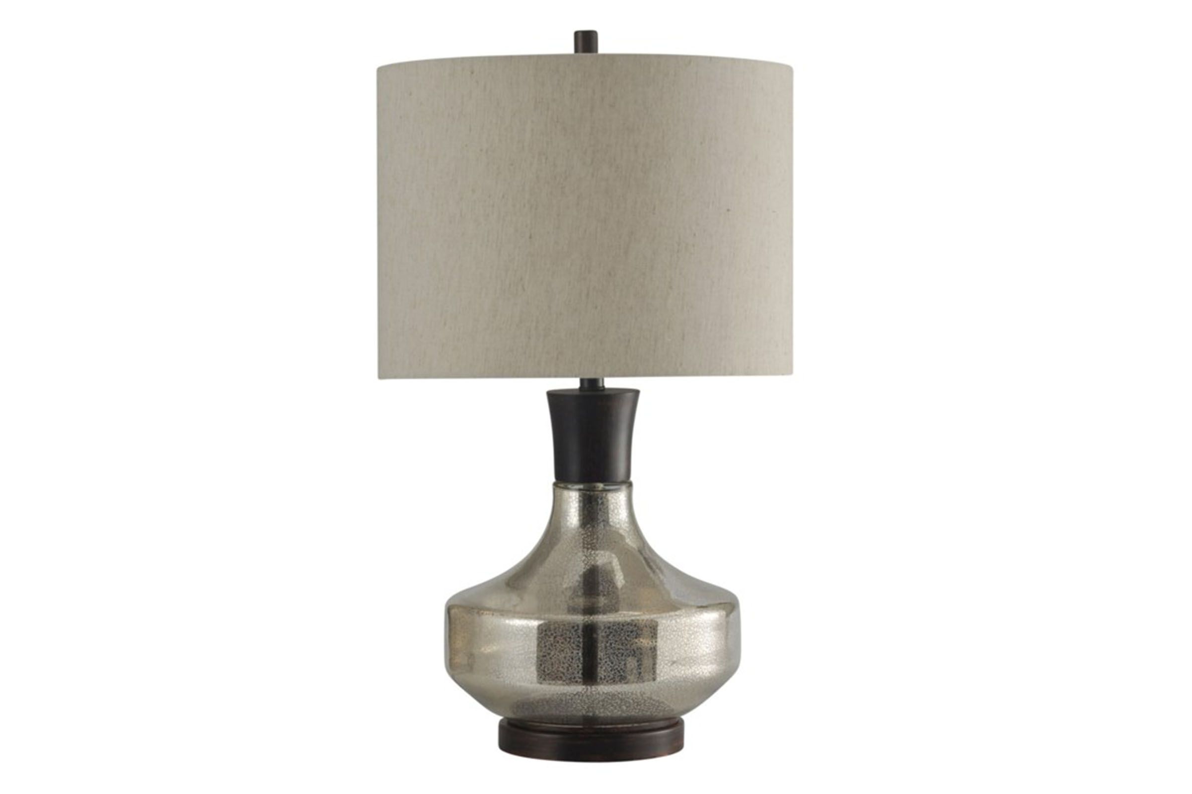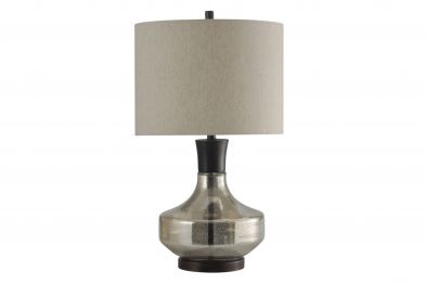 Illuminate your living space with the sophisticated glass and metal, Alamos 29" Table Lamp. Neutral mercury glass on the base and shade will warm up any space while the sleek and clean brushed nickel finish adds visual interest.