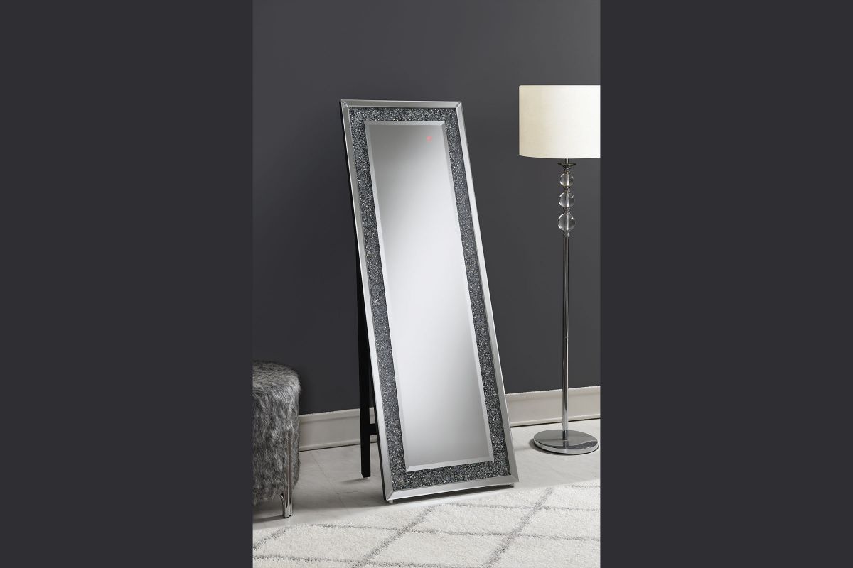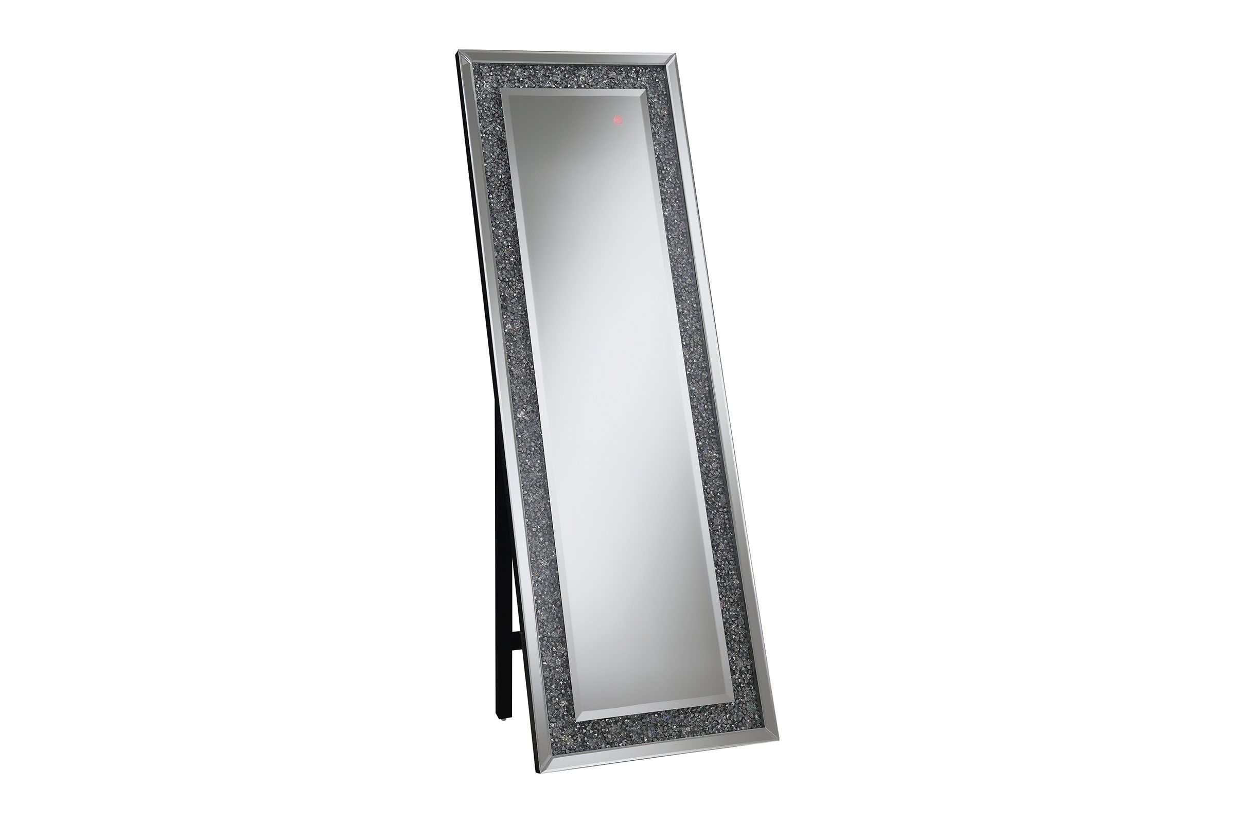 Bring a cool vibrancy to your home when you add this standing mirror. It features MDF and mirror construction that brightens up a bedroom or makes for a unique addition to the foyer. The silver finish is embellished with crystal accents that give the mirror a splash of panache. Yet, the LED lighting around frame really enlivens the home and sets it apart from other mirrors. You'll always be sure you look good with this stunning standing mirror.