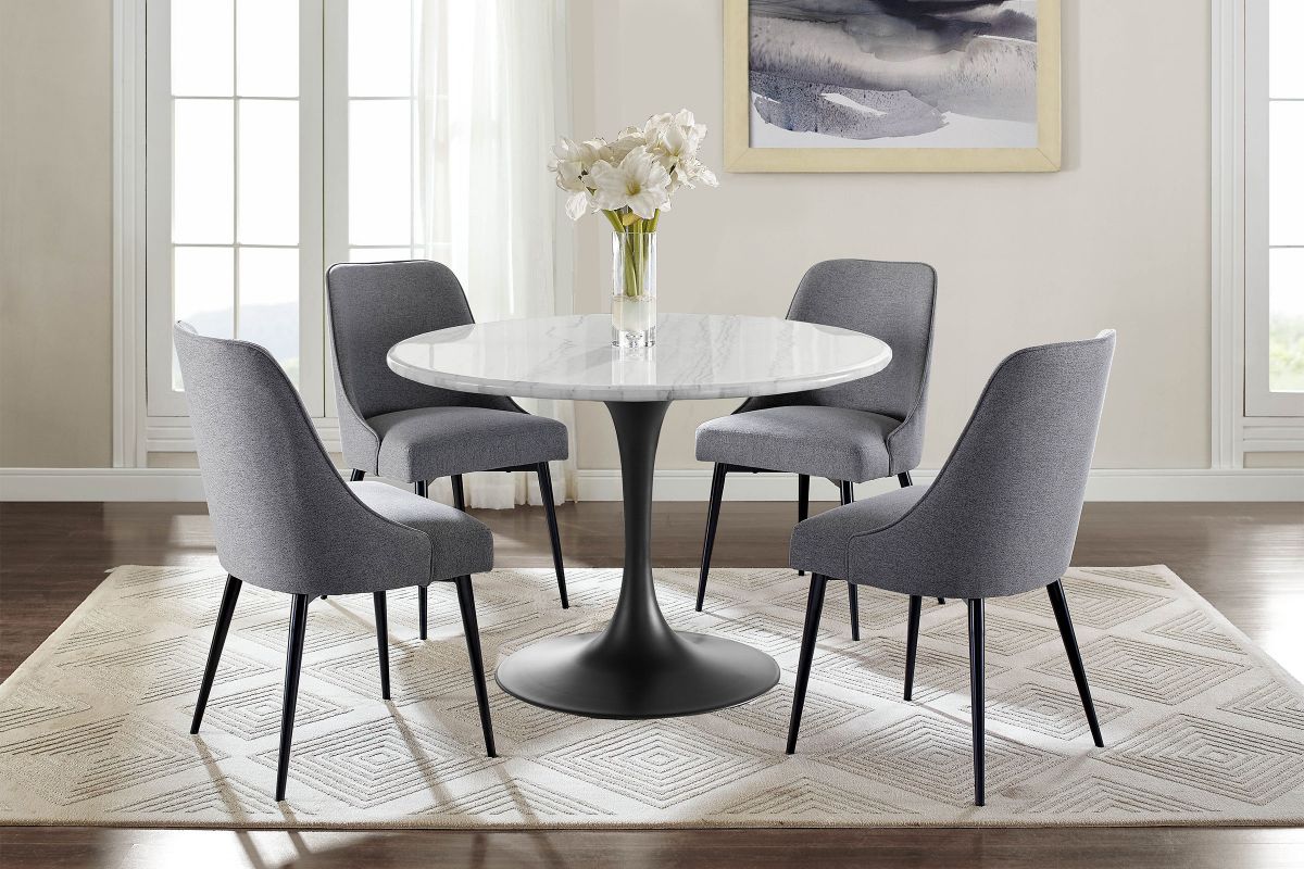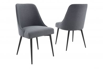 The Colfax upholstered side chair is comfortable and fashion-forward with canted metal legs and is shown in grey-charcoal fabric.