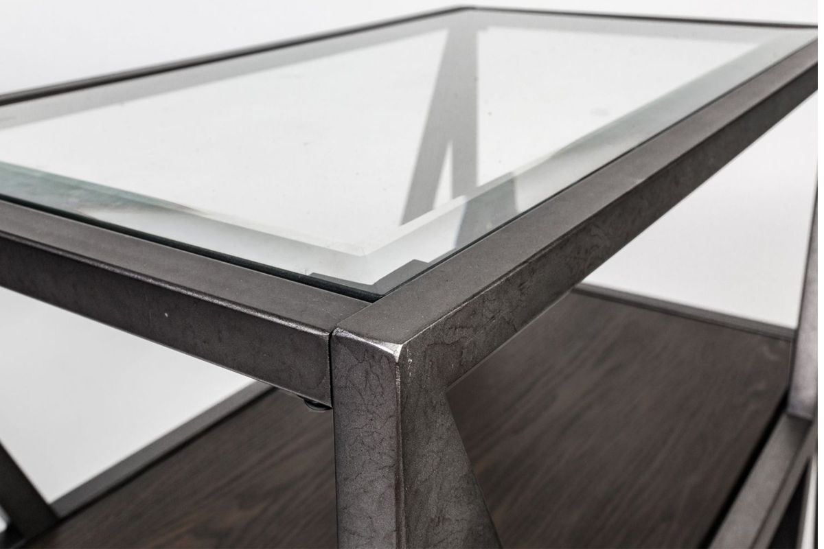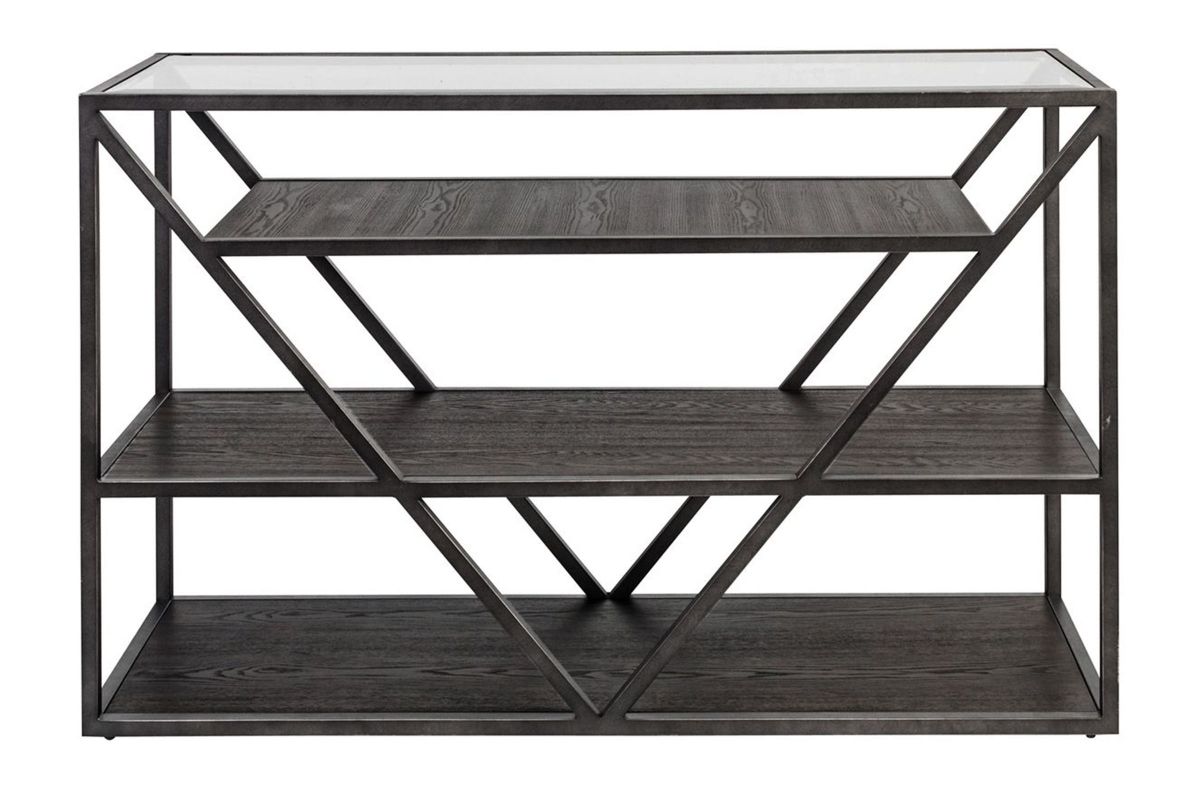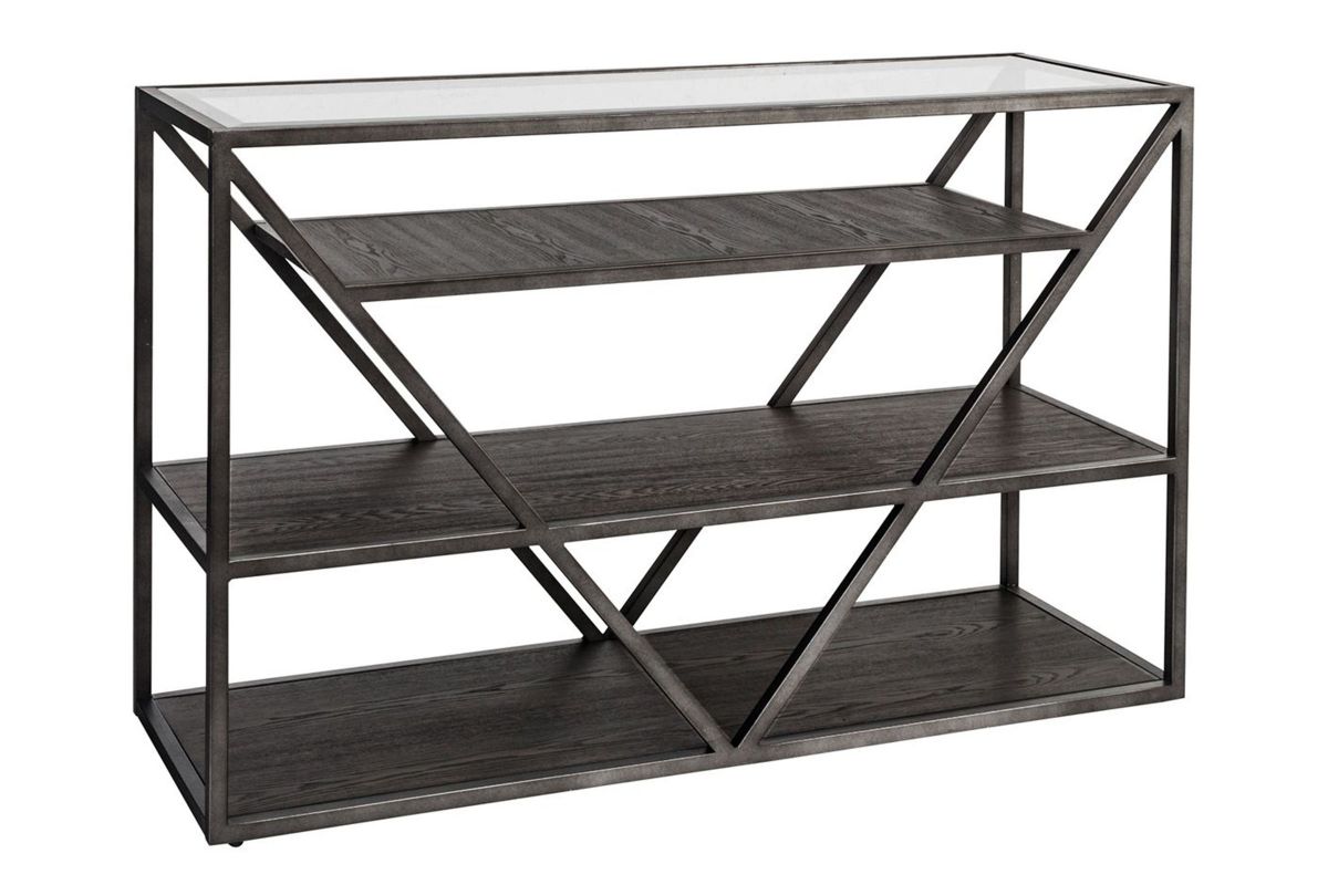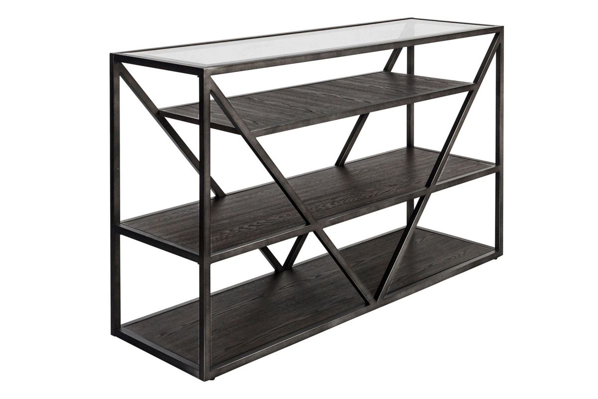 Accent your space with the urban living Arista sofa table. Crafted of ash veneer and metal tube framing, this piece features a cobblestone brown finish with gray dusty wax hang up, three floating wood shelves for additional storage, a beveled glass top, anchored by a metal framed V shape design. This one of a kind table will pair well with any rustic, casual or contemporary space.