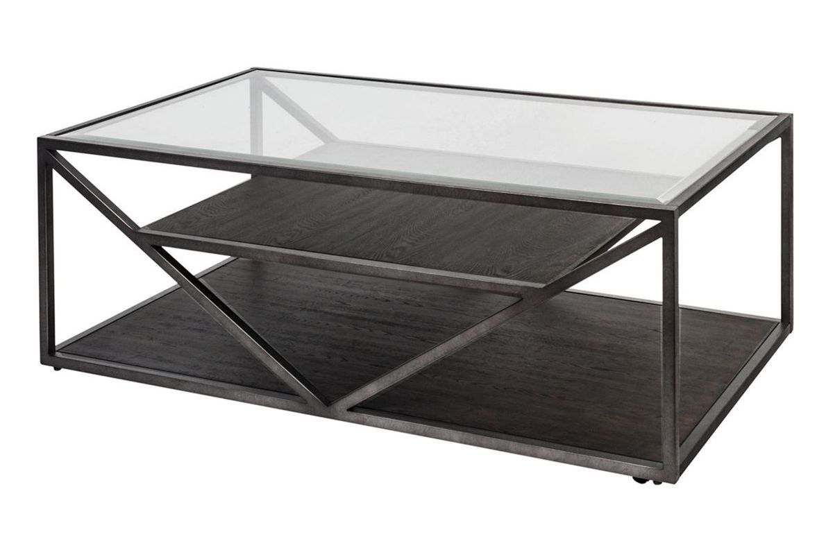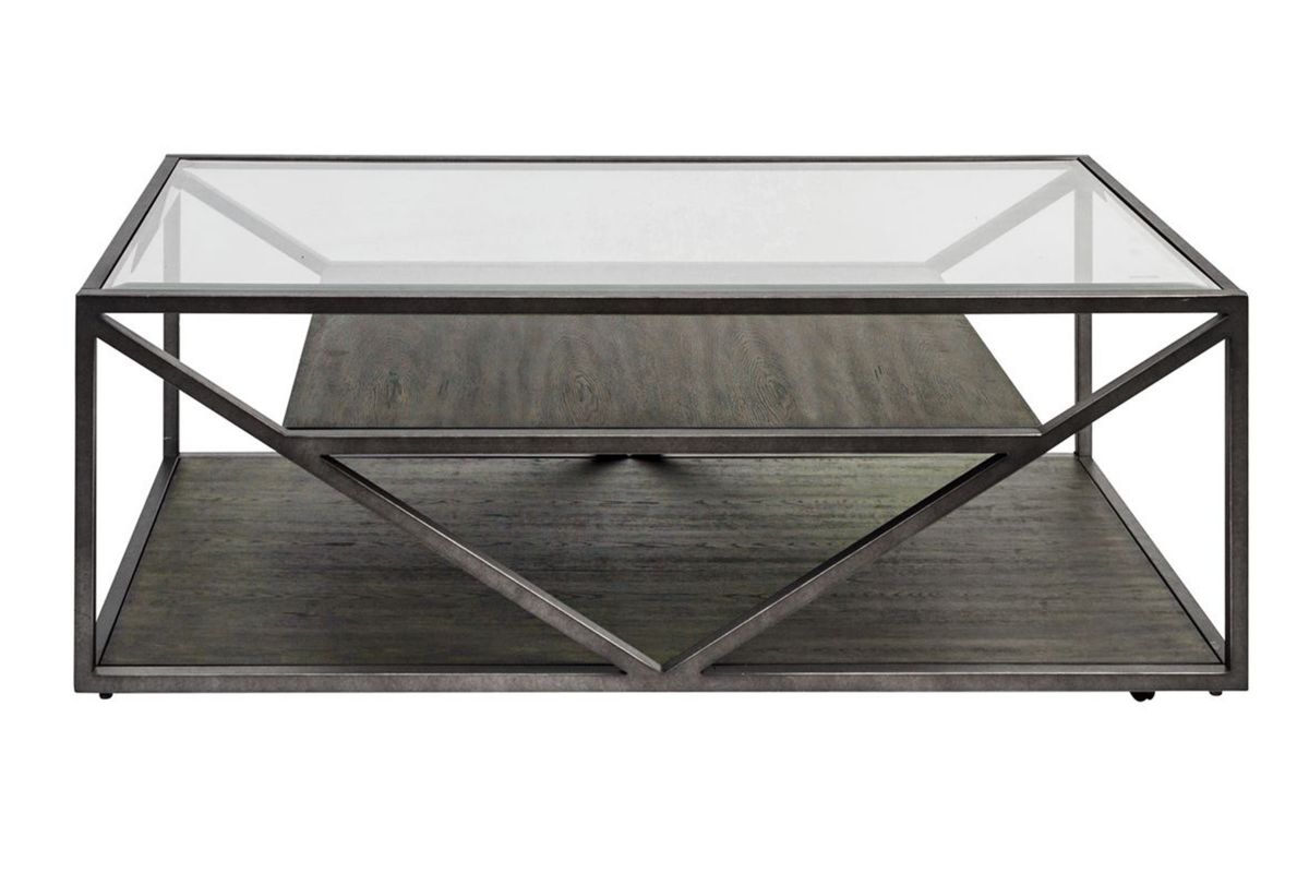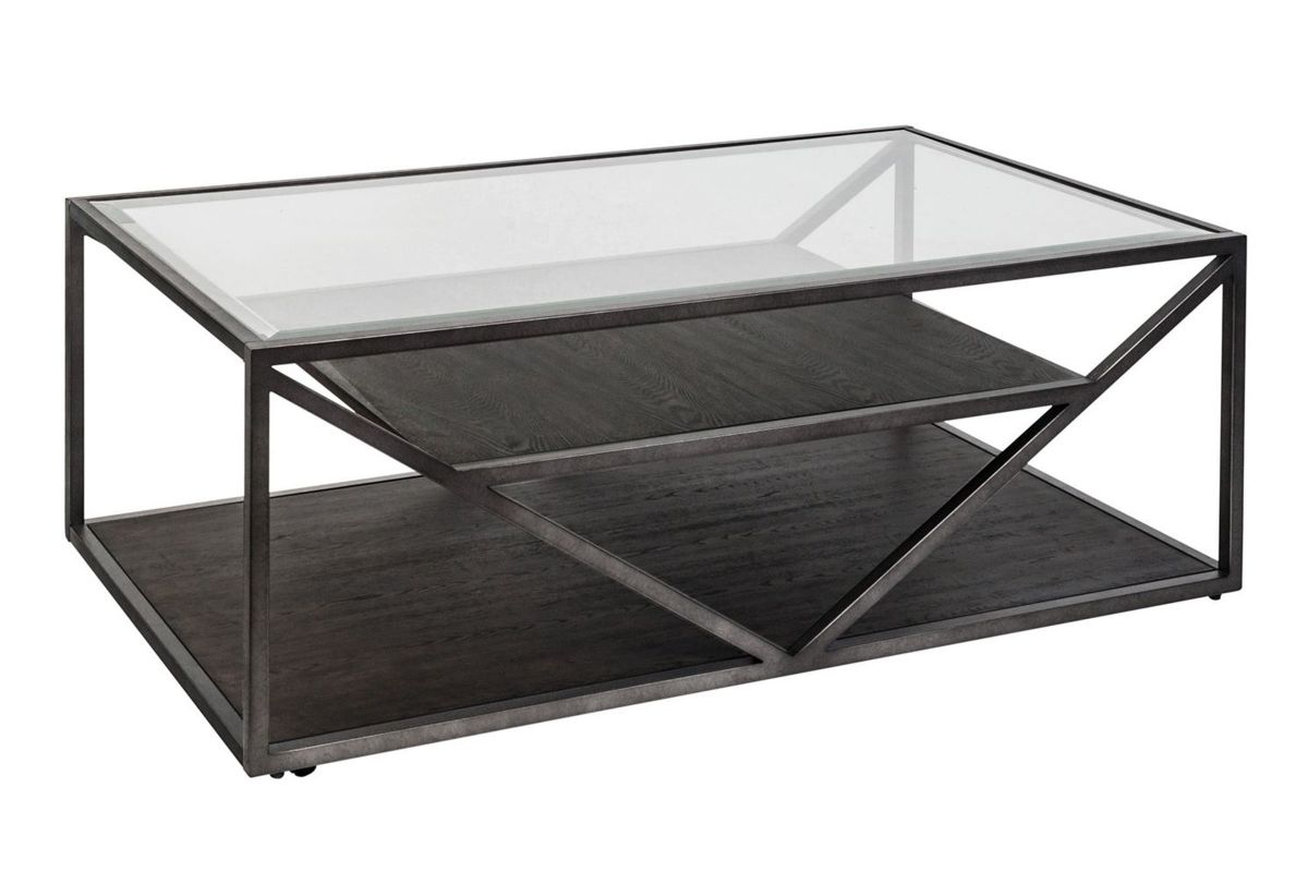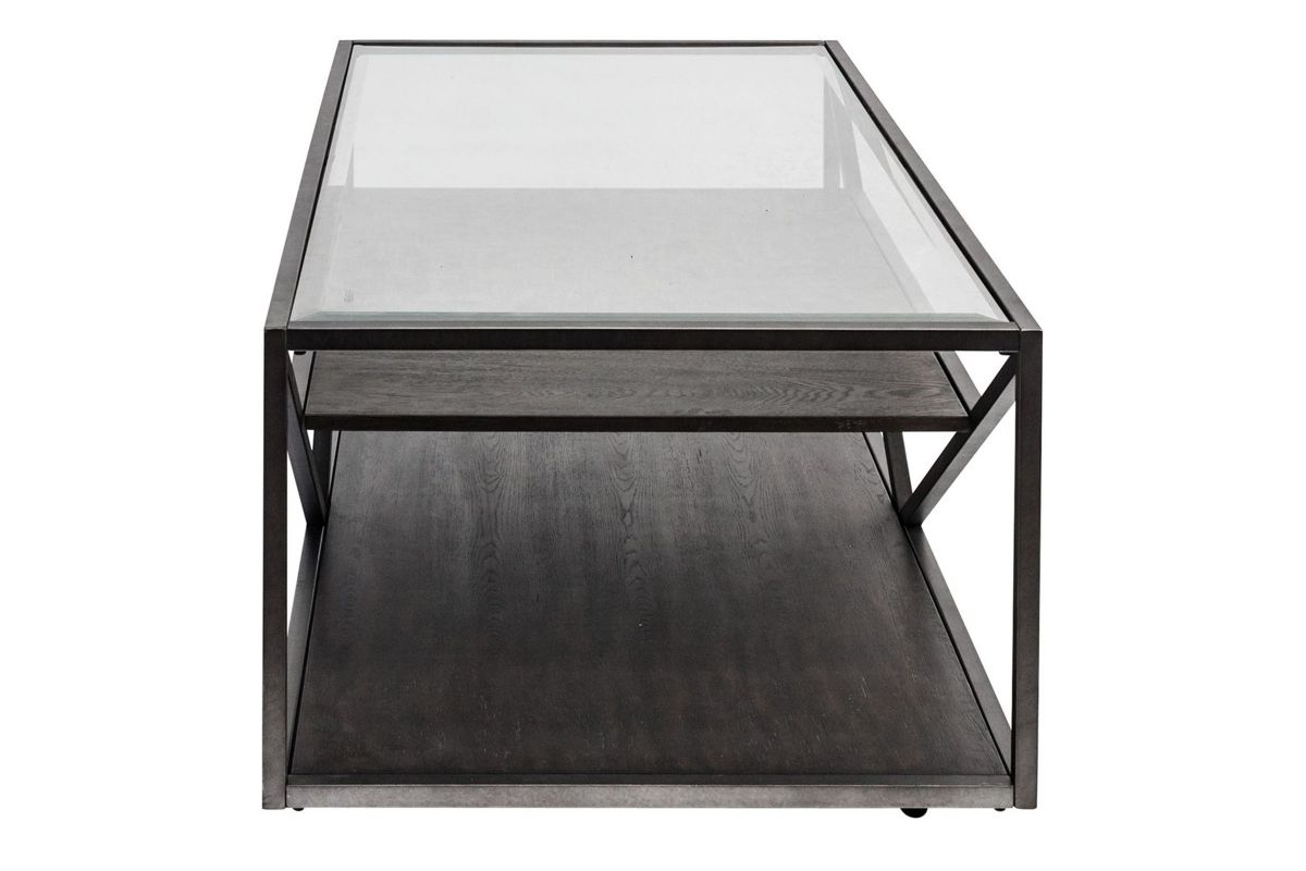 Enhance your space with the urban living Arista rectangular cocktail table. Crafted of ash veneer and metal tube framing, this piece features a cobblestone brown finish with gray dusty wax hang up, two floating wood shelves for additional storage, casters for easy moveability, a beveled glass top, anchored by a metal framed V shape design. This one-of-a-kind table will pair well with any rustic, casual or contemporary space.