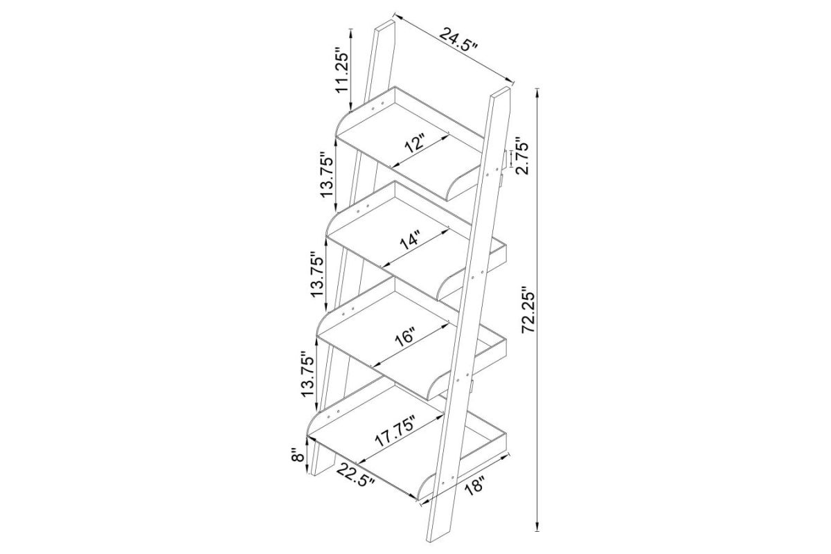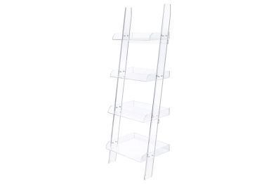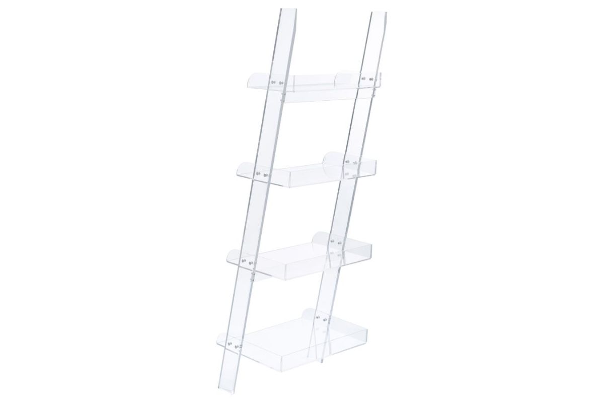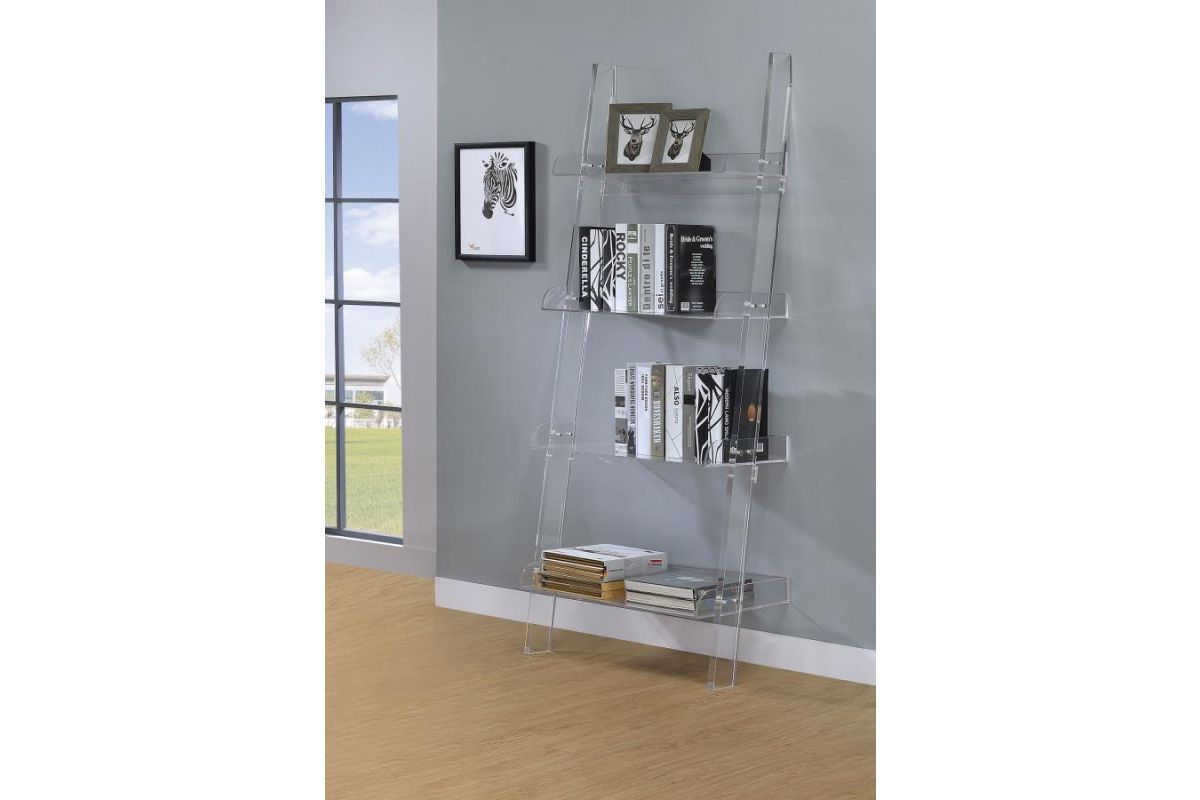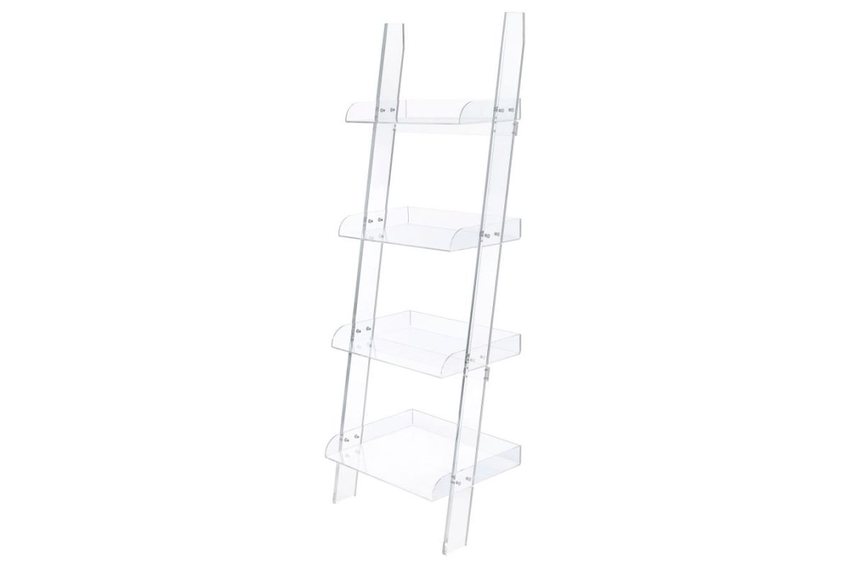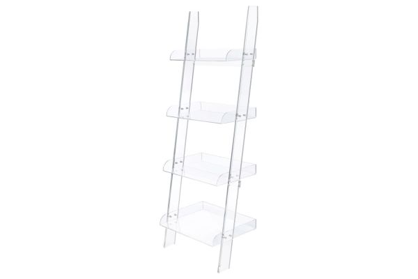 Try something new in a contemporary space. Clean and bright character resonates in this clear bookcase. Constructed from acrylic, its four shelves align on a slant. This ladder-style bookcase offers an eye-pleasing impact and a new look overall. Blend with contrasting or coordinating surrounding pieces to shape an unforgettable home office or living space.