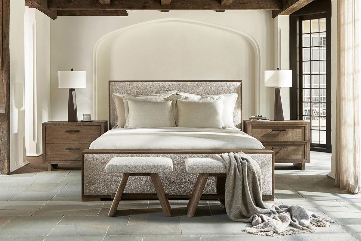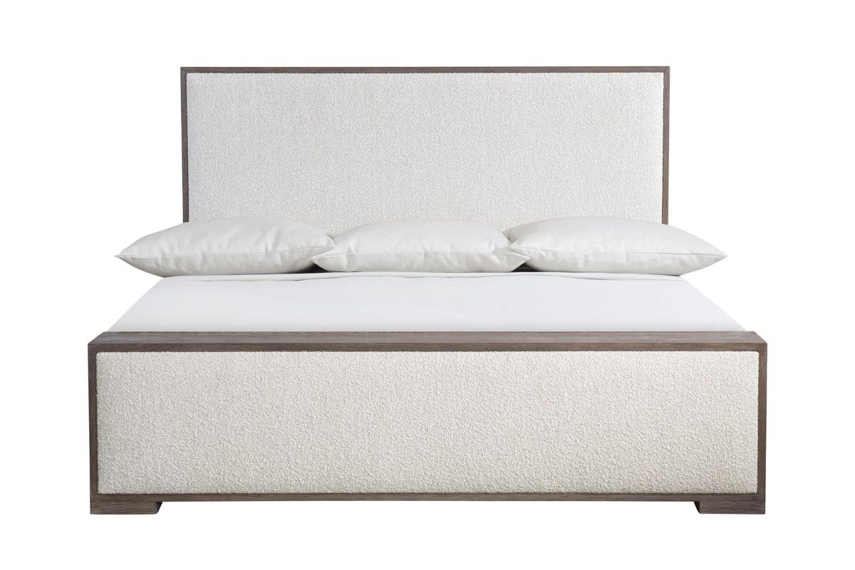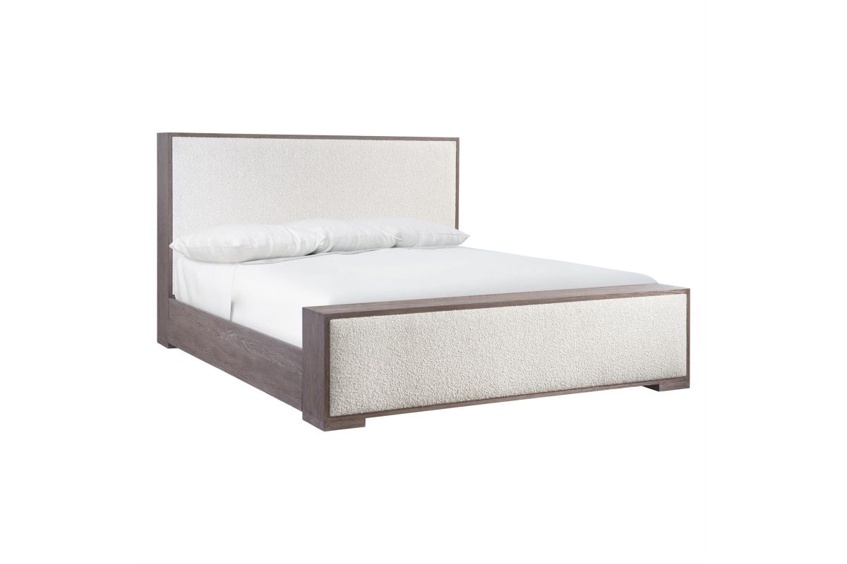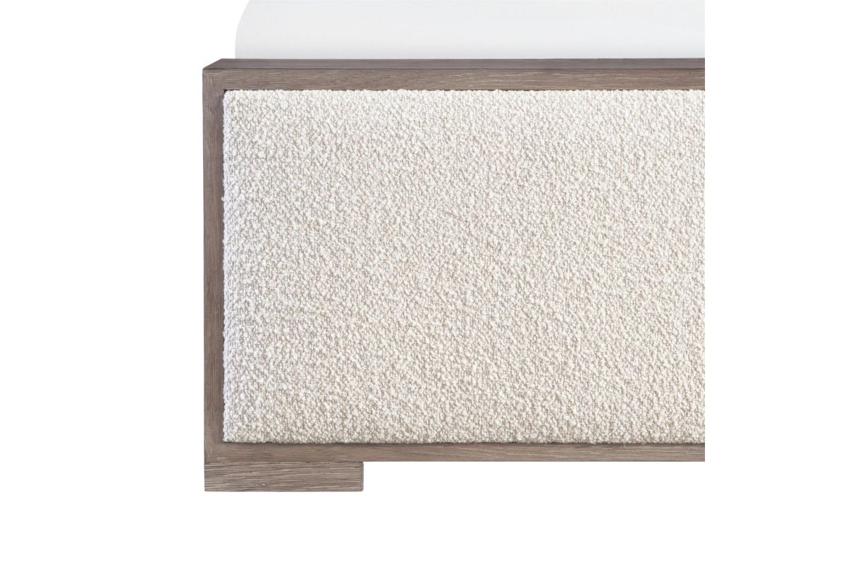 An understated tactile style is showcased in the Casa Paros panel bed. A deep wood frame in the Playa finish surrounds inset upholstered panels on the headboard and footboard. The low footboard is deep enough to be used as a bench.