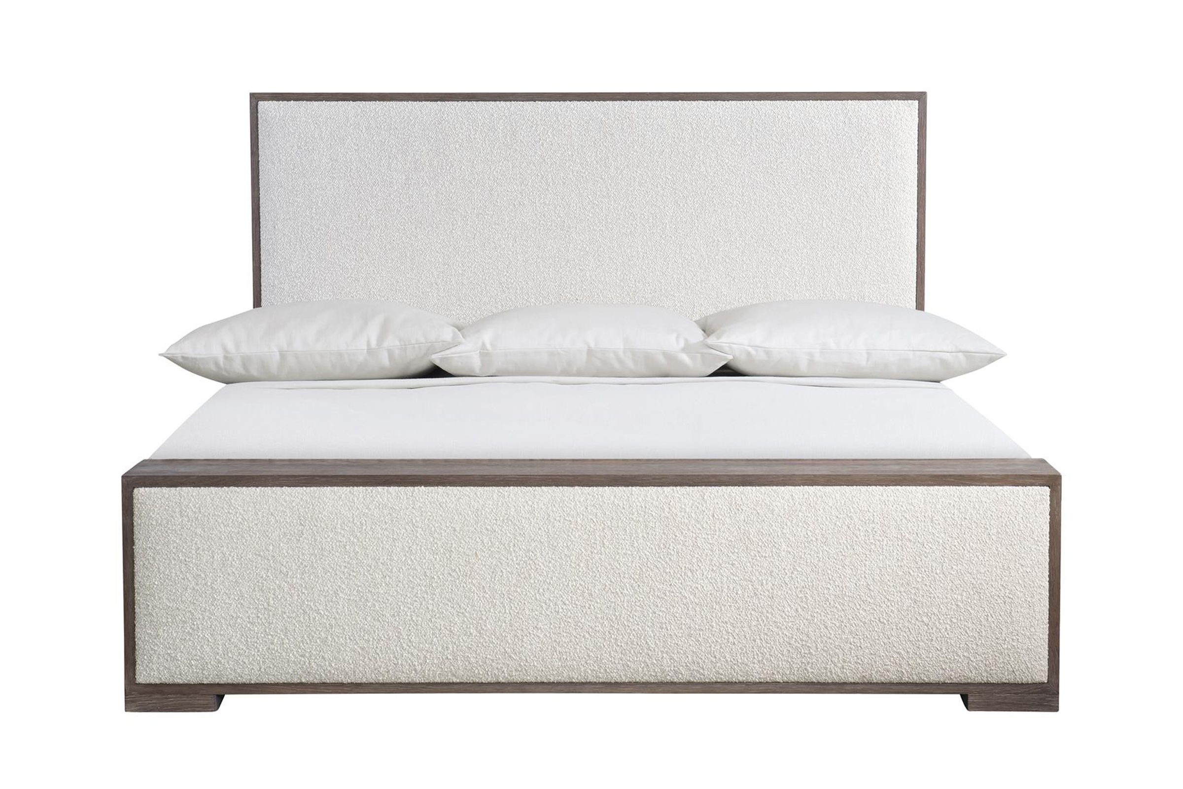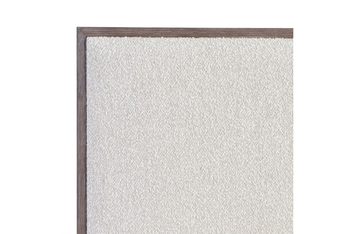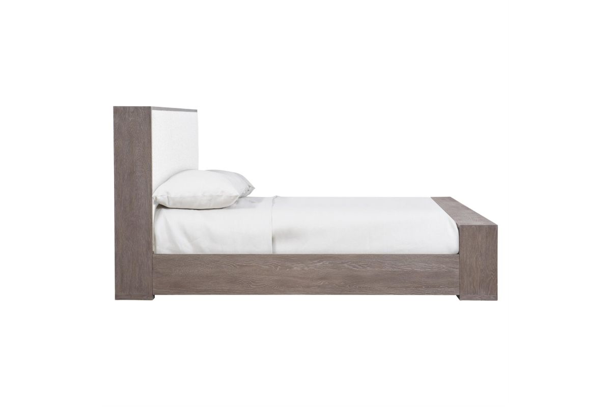 An understated tactile style is showcased in the Casa Paros panel bed. A deep wood frame in the Playa finish surrounds inset upholstered panels on the headboard and footboard. The low footboard is deep enough to be used as a bench.