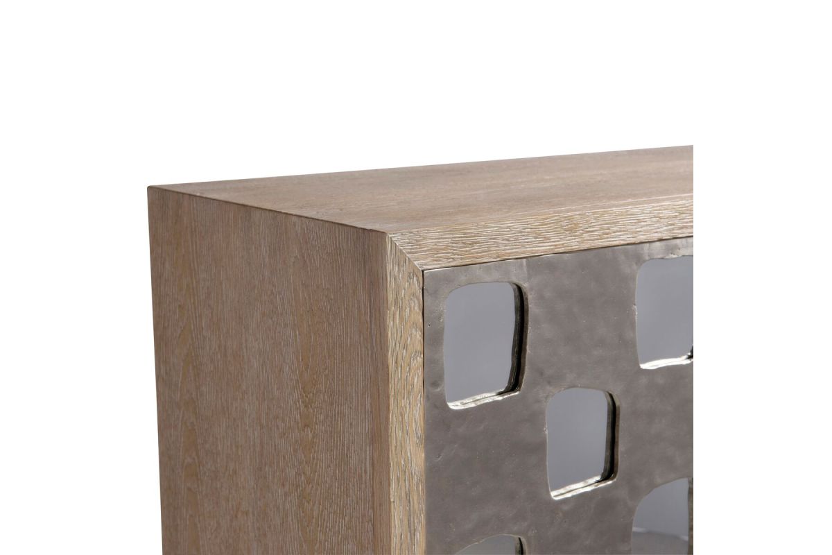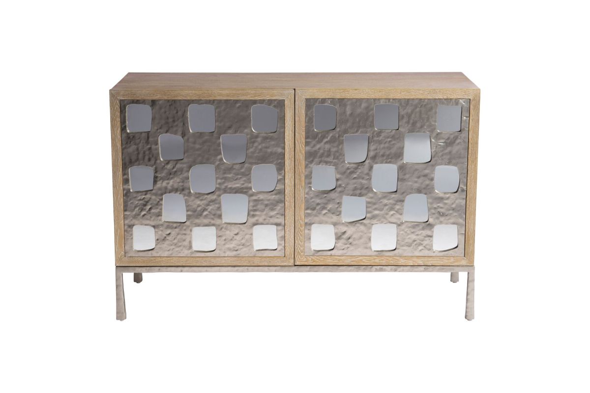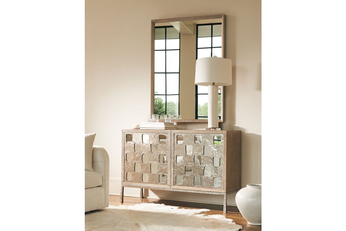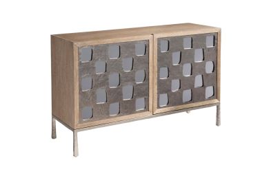 The Aventura door chest has a bright, casual sophistication thanks to a statement-making metal overlay. Showcasing geometric cutouts, the overlay allows a mirrored back to show through on two push-to-open, soft-close doors. The doors each conceal one adjustable shelf.