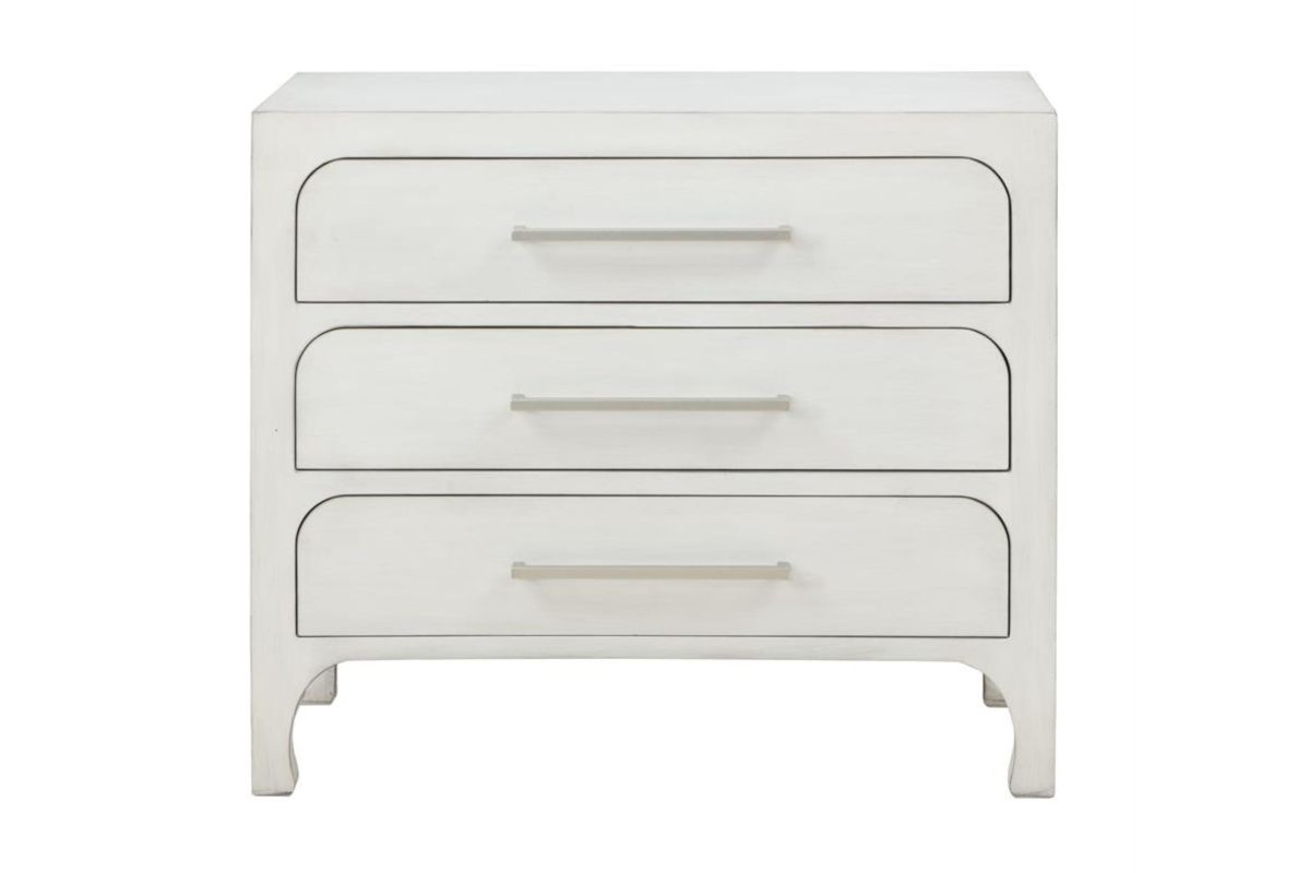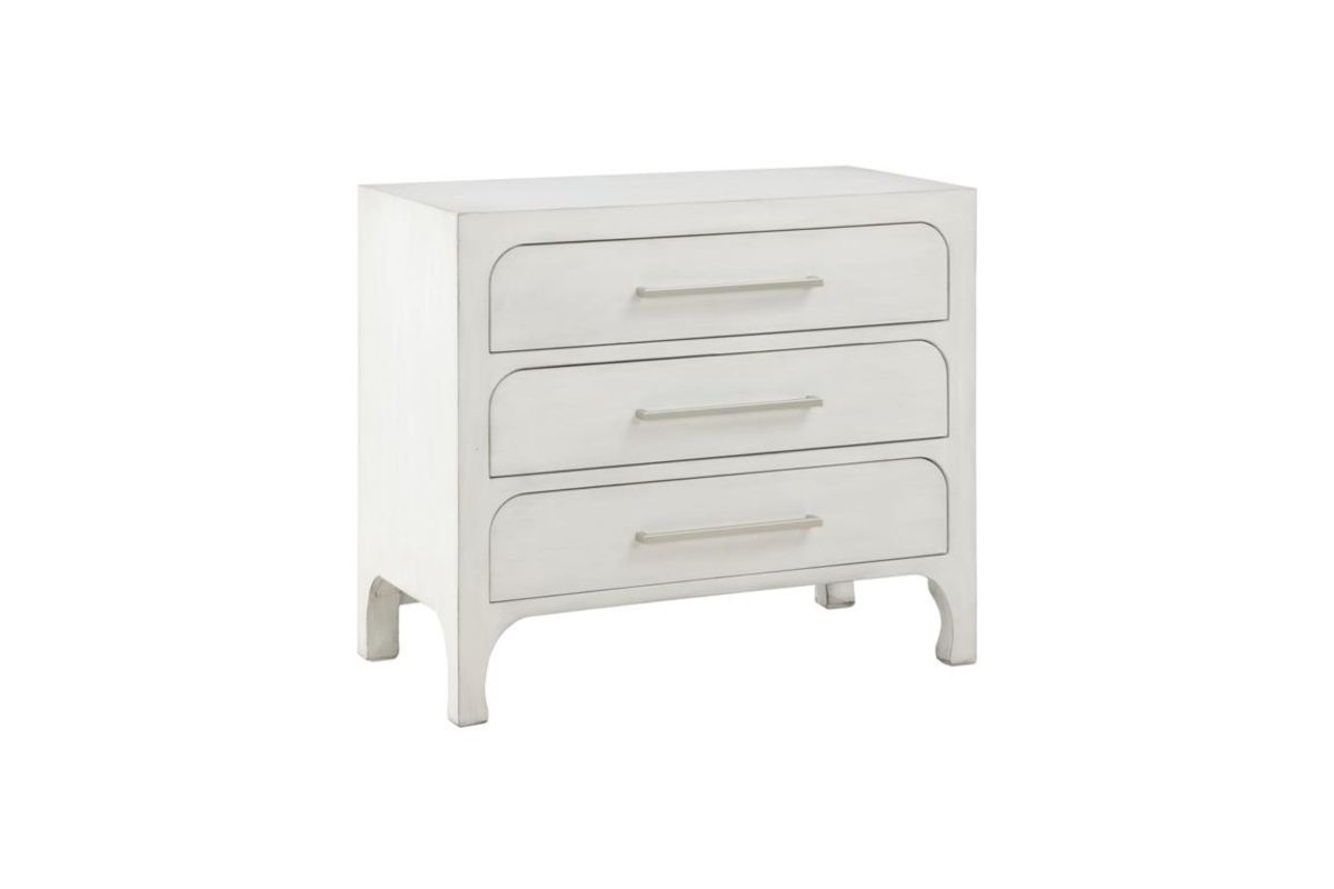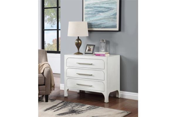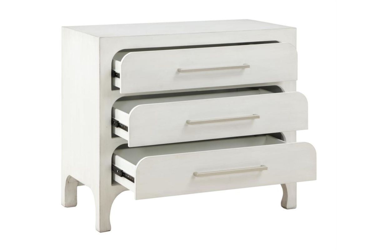 Introduce an alluring addition to your space with this white chest. Its unadorned clean-lined structure makes it an ideal storage and display unit. Three drawers, complete with curved edges and silver-finished drawer pulls, provide ample storage space. The smooth and level opening and closing of each drawer is facilitated by extended drawer glides. Further, adjustable floor levelers have been included to ensure that the chest remains level on uneven surfaces