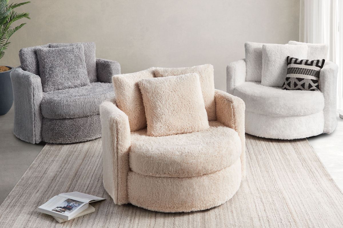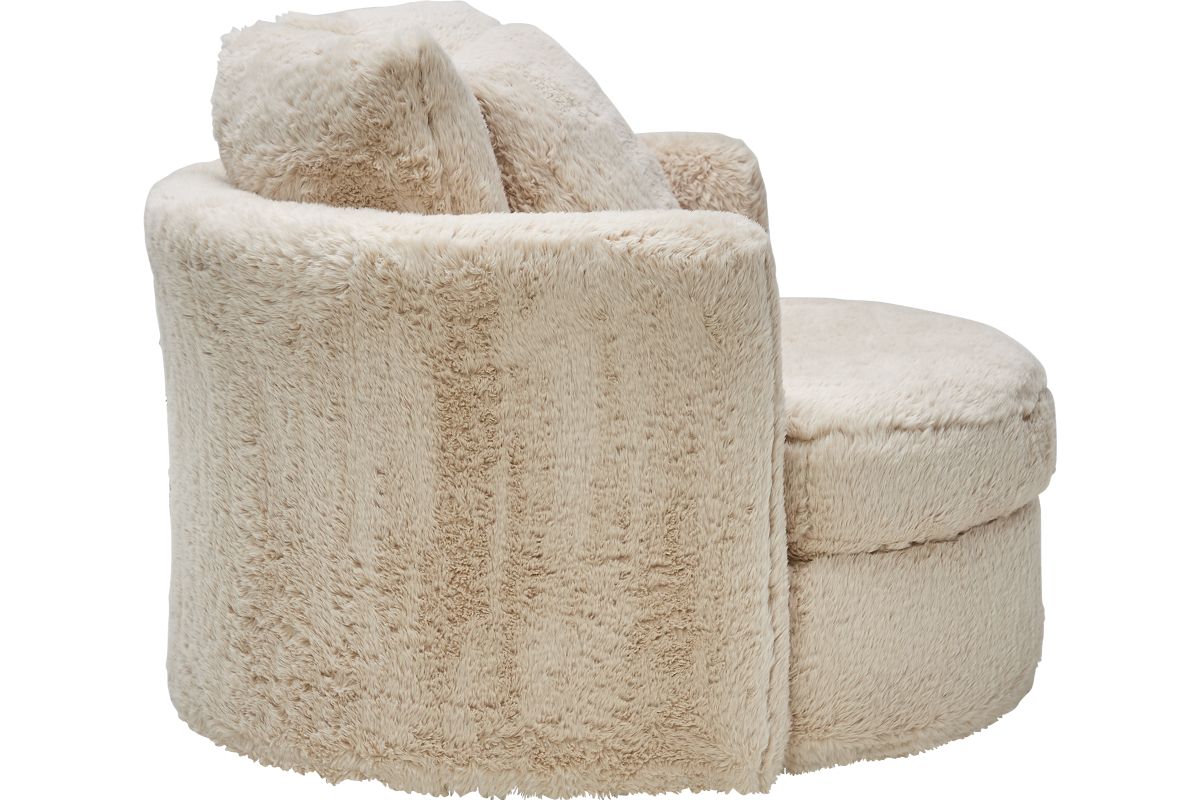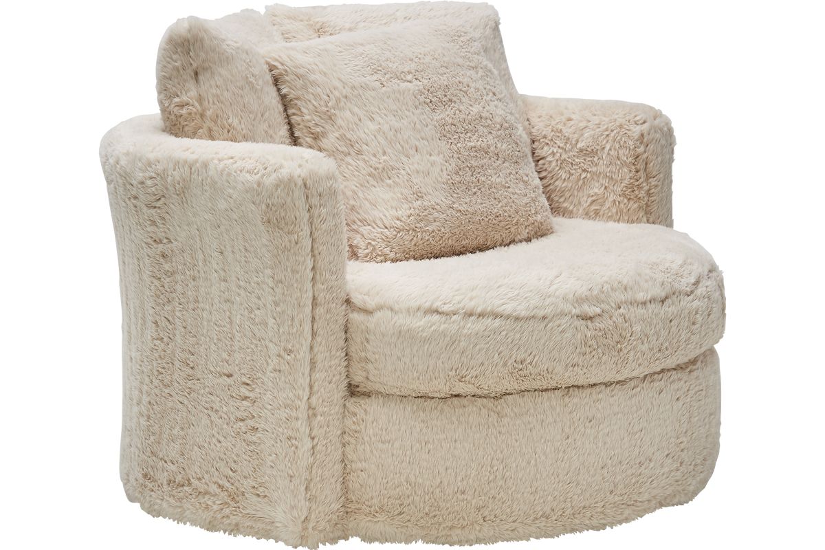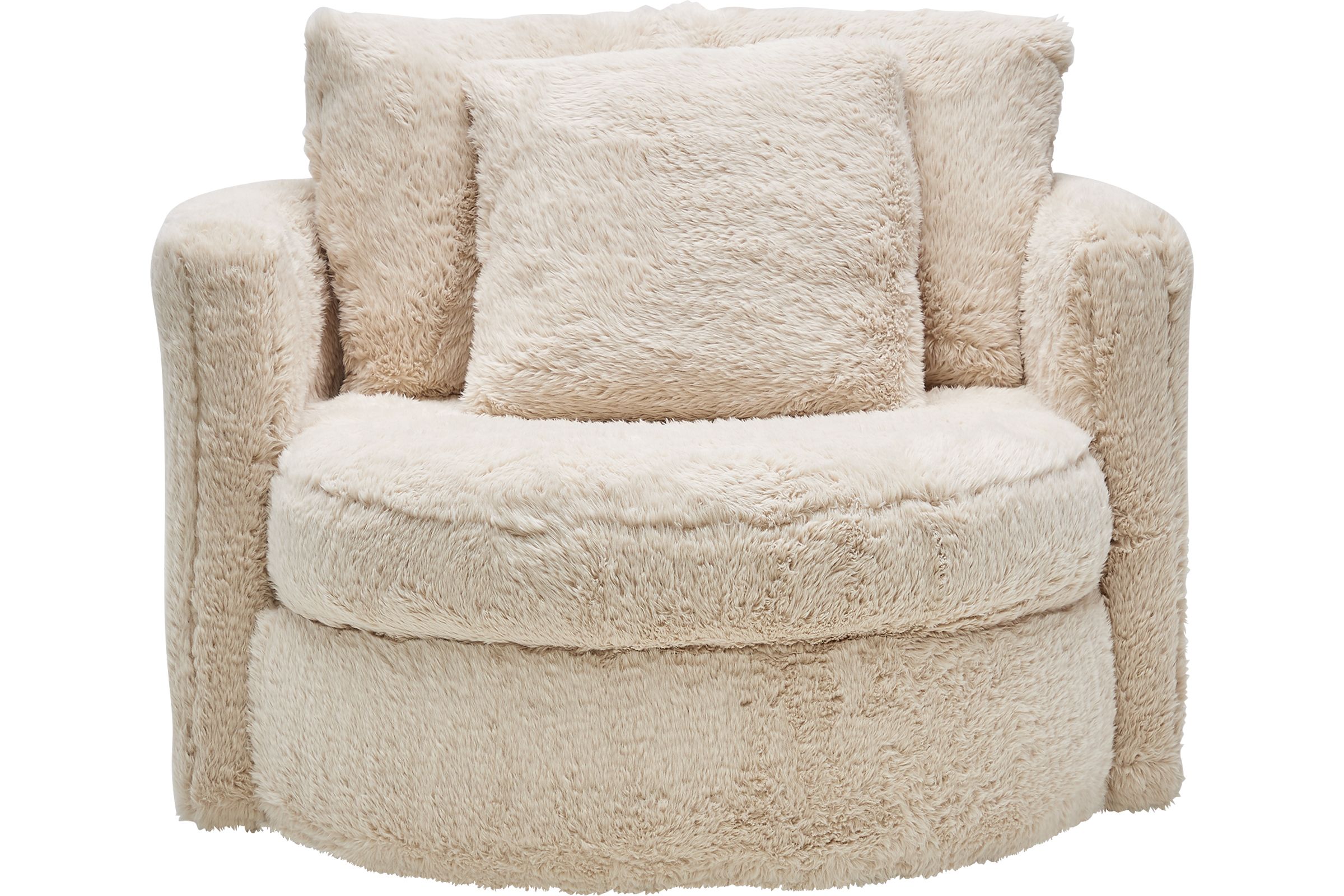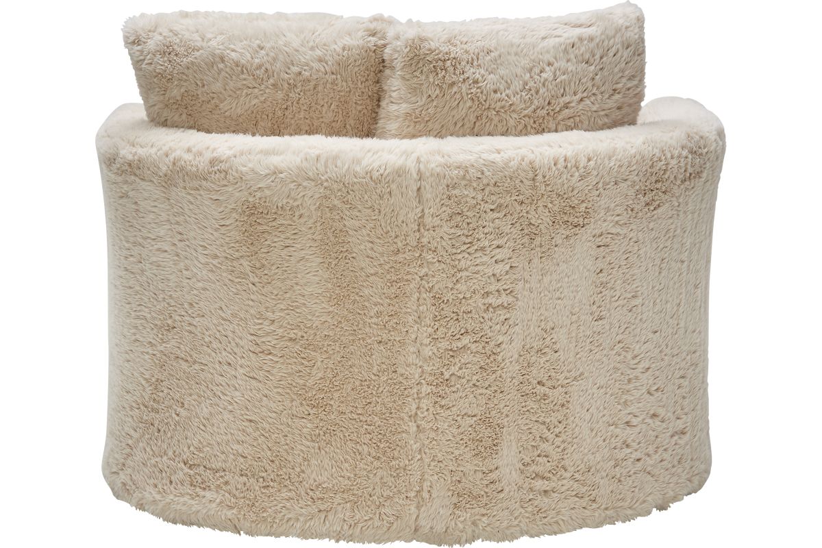 Upholstered in a fuzzy faux fur fabric, this accent chair exudes an aura of warmth and welcome. Chic and brimming in softness, the texture complements the rounded silhouette of the piece perfectly. Lounge on the wide firm seat cushions as you lean back on the plush oversized back pillows.