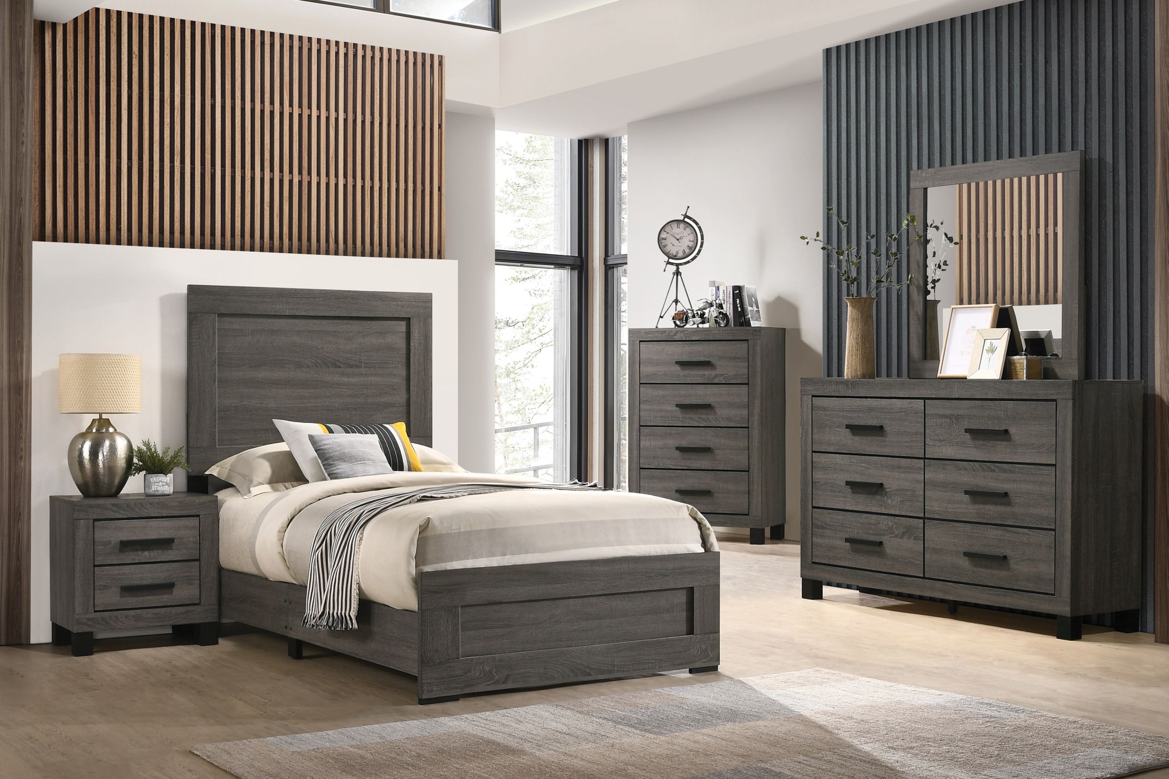 Casual style at a value, the Ethan Collection will easily become your new favorite bedroom set. It features a weathered grey finish, with contrasting dark hardware and clean crisp lines.