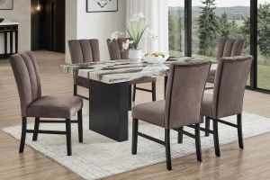 This bold and contemporary dining group features a dramatic marble-look tabletop with dynamic veining that mimics natural stone, adding an upscale, artistic touch to any dining space. The sculptural black pedestal base complements the striking tabletop, creating a luxurious edge perfect for elevating everyday meals and stylish entertaining. Paired with sleek, channel-tufted chairs and a coordinating bench in plush upholstery