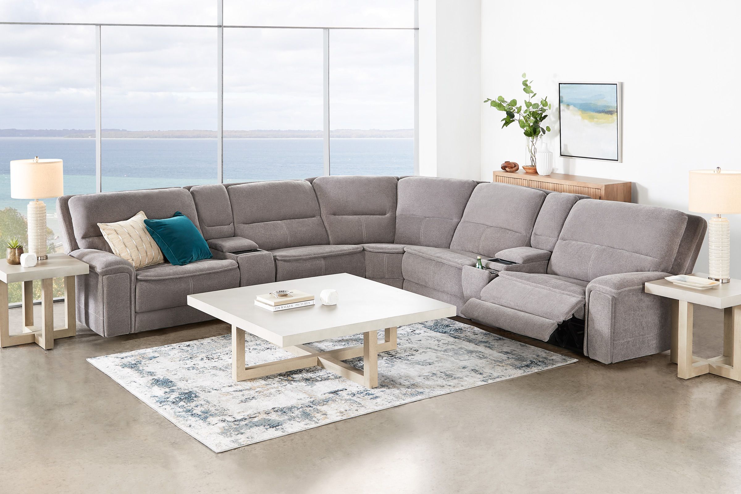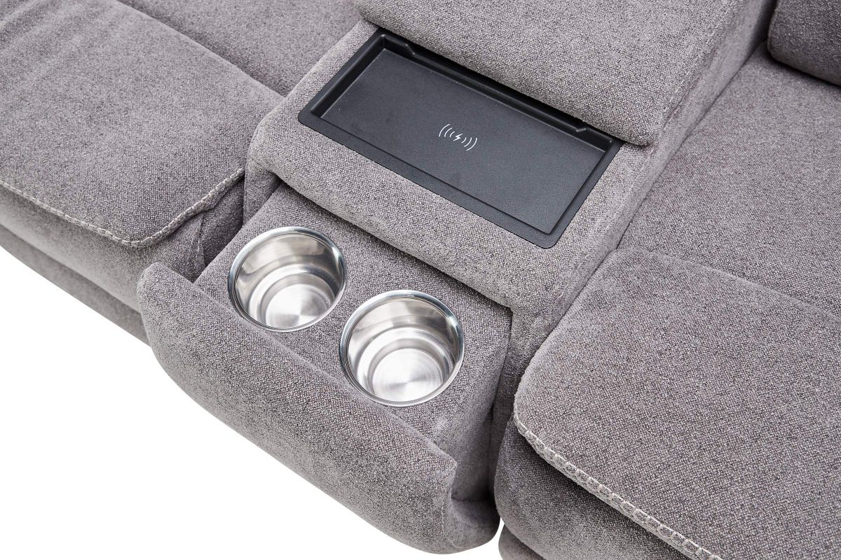 The Vixen 7-Piece Triple Power Reclining Sectional features 2 consoles with hidden cupholders, a wireless charger for your devices, and storage, as well as 2 recliners that both feature the triple threat of power reclining, power adjustable headrests, and power adjustable lumbar support.