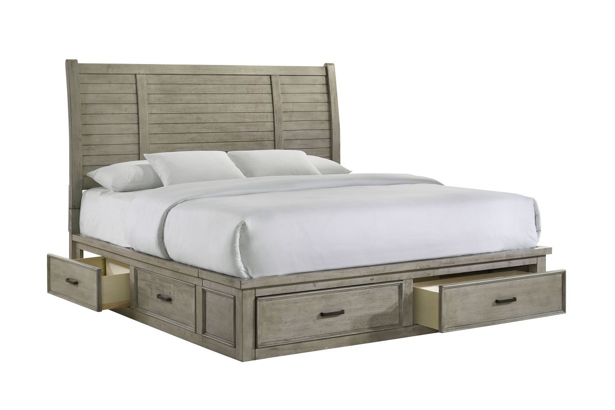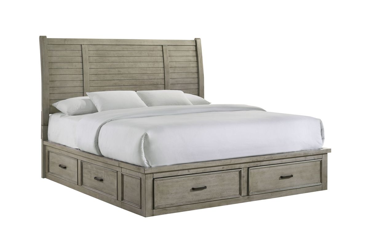 Dressed in a light Drift Grey finish, the handsome Yates bedroom collection is the perfect addition to any room. Featuring clean lines and ample storage space, this transitional set is sure to please. The bed is simplistically handsome with a sleigh wood panel headboard. Matching case pieces featuring spacious drawers complete the look of this modern farmhouse inspired collection.