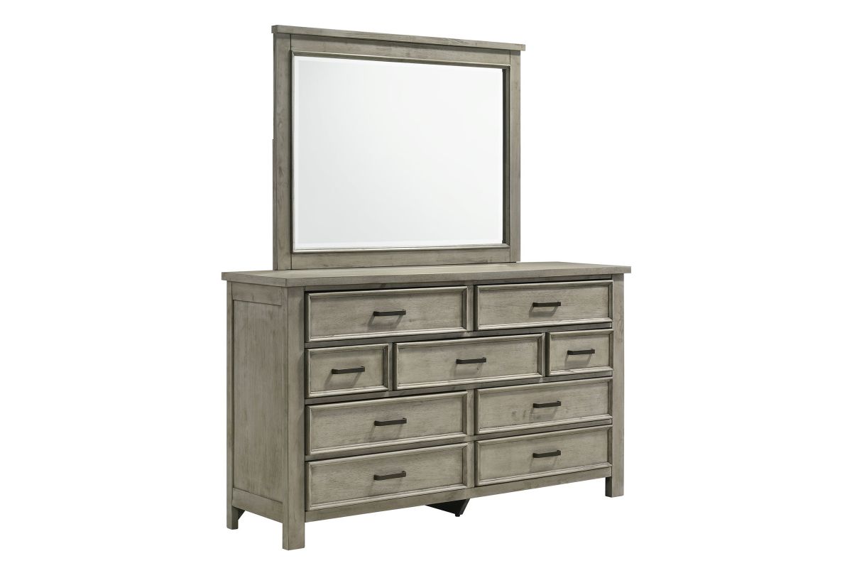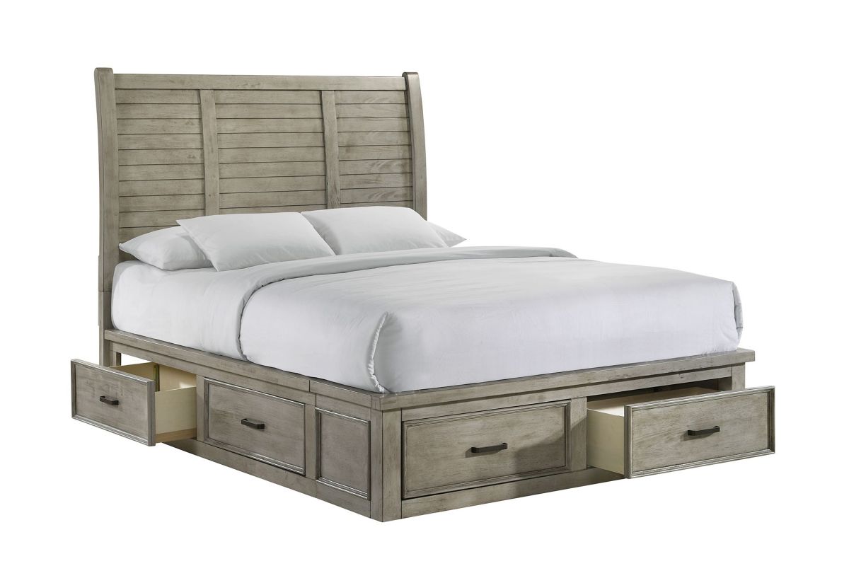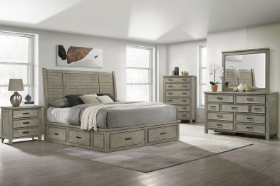 Dressed in a light Drift Grey finish, the handsome Yates bedroom collection is the perfect addition to any room. Featuring clean lines and ample storage space, this transitional set is sure to please. The bed is simplistically handsome with a sleigh wood panel headboard. Matching case pieces featuring spacious drawers complete the look of this modern farmhouse inspired collection.