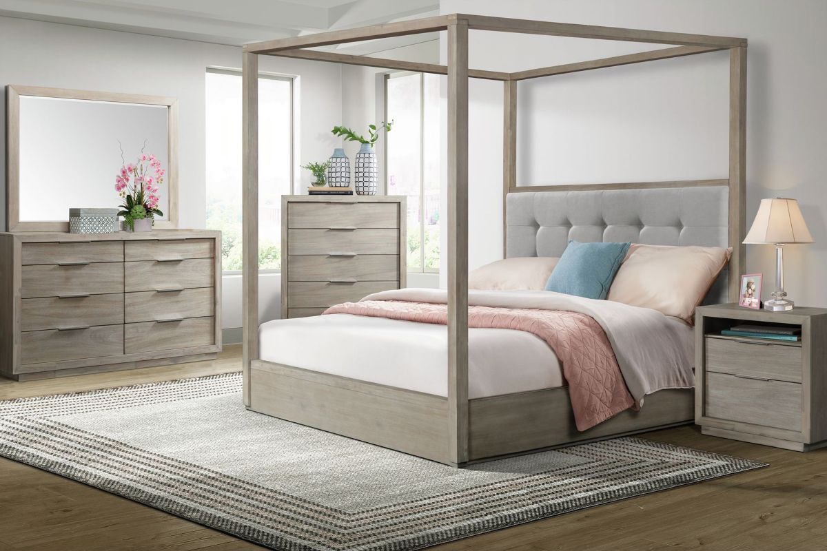 The grand sleek Bella Canopy collections flaunts a light toned wood finish inviting chic to your bedroom.This beautiful crafted set features a buscuit tufting headboard along with a wire-brushed finish.