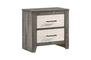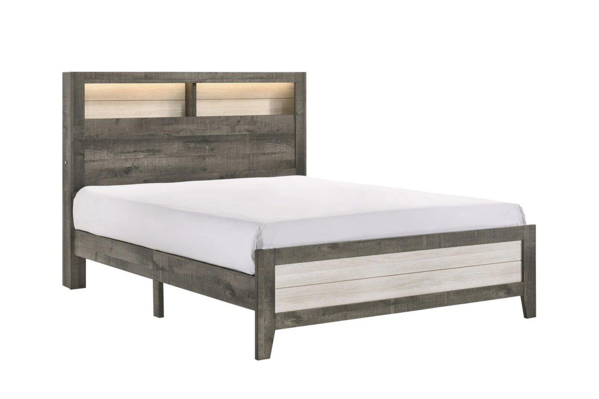Rustic meets contemporary in this 2 toned bedroom suite. With on trend Gray and White finishes and black bar handles, this group fits into a variety of décor styles. Woodgrain detail throughout lends depth and lighted headboard cubbies provide storage and display options. A touch switch on the side of the headboard makes it easy to get light right when you need it. The melamine finish provides durability. .