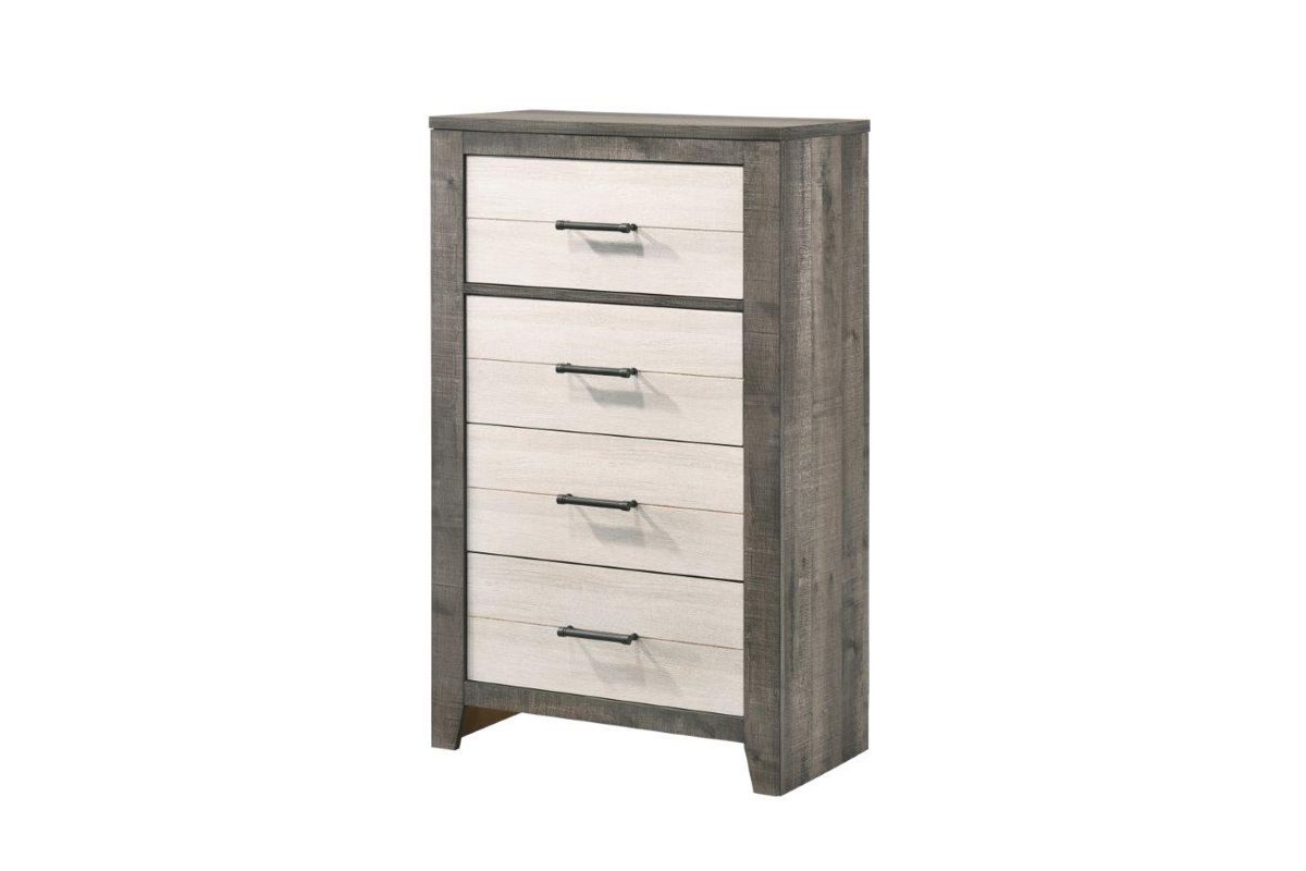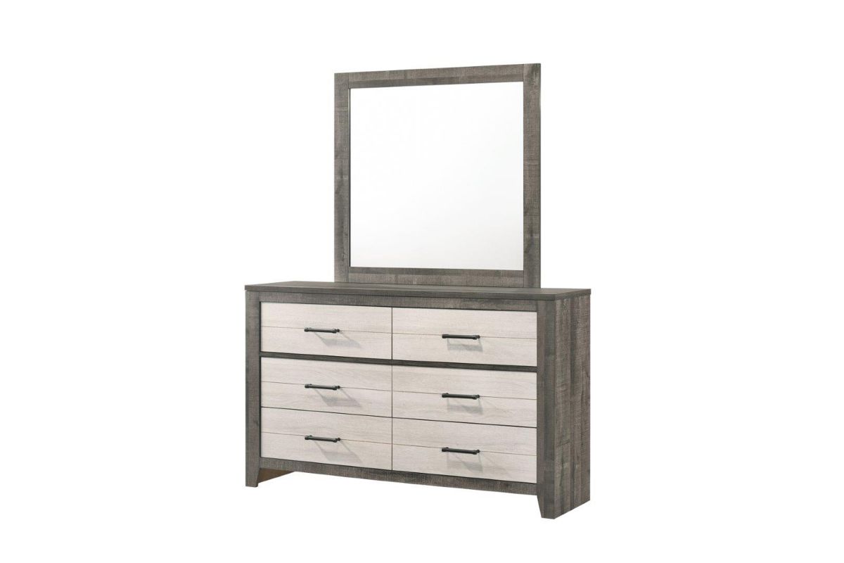 Rustic meets contemporary in this 2 toned bedroom suite. With on trend Gray and White finishes and black bar handles, this group fits into a variety of décor styles. Woodgrain detail throughout lends depth and lighted headboard cubbies provide storage and display options. A touch switch on the side of the headboard makes it easy to get light right when you need it. The melamine finish provides durability. .