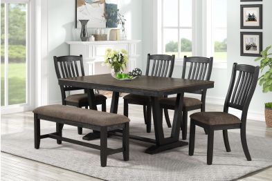Urban rustic styling and chic tailored touches combine to create the Crawford dining room. Crafted with wood solids and oak veneers, the collection has a rubbed black finish. Perfect for gathering family and friends, the table features a plank style top and supportive trestle base.
