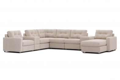 Discover the limitless possibilities of the Modular One sectional, thoughtfully designed with comfort and flexibility in mind. This customizable seating solution features individual pieces that can be reconfigured to the shape you need. Game days, movie nights, sleepovers, and everyday relaxation are all better when the seating arrangement you want is always right at your fingertips. This soft, beige chenille includes Repreve yarn, made with recycled plastic bottles. The open seating includes a chaise and has welted track arms, top-stitched seat cushions and button-tufted back cushions for an elegant silhouette. Two consoles provide hidden storage, USB charging ports, wireless charging, Bluetooth speakers, and double as side tables with sleek acrylic tops.