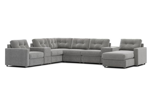 Discover the limitless possibilities of the Modular One sectional, thoughtfully designed with comfort and flexibility in mind. This customizable seating solution features individual pieces that can be reconfigured to the shape you need. Game days, movie nights, sleepovers, and everyday relaxation are all better when the seating arrangement you want is always right at your fingertips. This soft, grey chenille includes Repreve yarn, made with recycled plastic bottles. The open seating includes a chaise and has welted track arms, top-stitched seat cushions and button-tufted back cushions for an elegant silhouette. Two consoles provide hidden storage and double as side tables with acrylic tops.