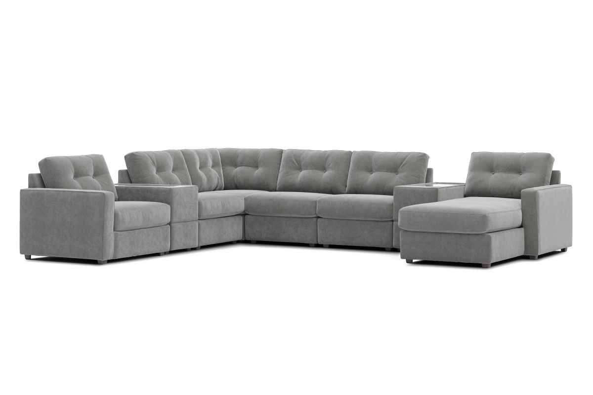 Discover the limitless possibilities of the Modular One sectional, thoughtfully designed with comfort and flexibility in mind. This customizable seating solution features individual pieces that can be reconfigured to the shape you need. Game days, movie nights, sleepovers, and everyday relaxation are all better when the seating arrangement you want is always right at your fingertips. This soft, grey chenille includes Repreve yarn, made with recycled plastic bottles. The open seating includes a chaise and has welted track arms, top-stitched seat cushions and button-tufted back cushions for an elegant silhouette. Two consoles provide hidden storage, USB charging ports, wireless charging, Bluetooth speakers, and double as side tables with sleek acrylic tops.