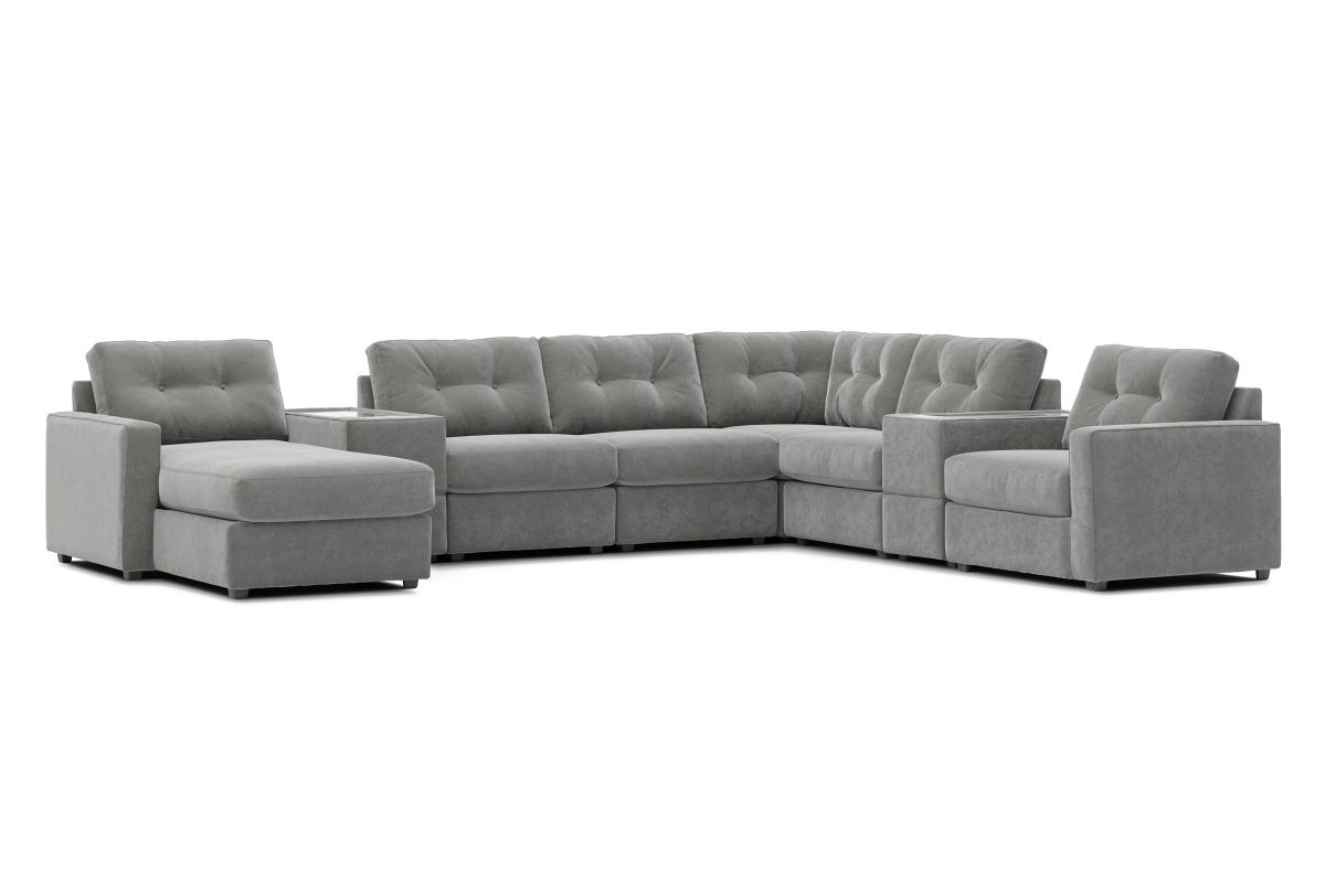 Discover the limitless possibilities of the Modular One sectional, thoughtfully designed with comfort and flexibility in mind. This customizable seating solution features individual pieces that can be reconfigured to the shape you need. Game days, movie nights, sleepovers, and everyday relaxation are all better when the seating arrangement you want is always right at your fingertips. This soft, grey chenille includes Repreve yarn, made with recycled plastic bottles. The open seating includes a chaise and has welted track arms, top-stitched seat cushions and button-tufted back cushions for an elegant silhouette. Two consoles provide hidden storage, USB charging ports, wireless charging, Bluetooth speakers, and double as side tables with sleek acrylic tops.