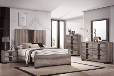 The Zeller Bedroom Group will be the bright spot in every home. This transitional set utilizes the warmth and strength of wood veneers coupled with contemporary flair to create a stunning set. French Dovetail oversized drawers and Kenlin Drawer glides assure you of great storage, ease of use, and years of service. The LED lighting on the grand headboard lights the centerpiece of the room with a three position touch switch, located on each side of the headboard. The substantial mirror with a warm wooden frame high-lights the insets on each of the case pieces creating dimesion and depth. The pewter luster on the hardware looks right at home.