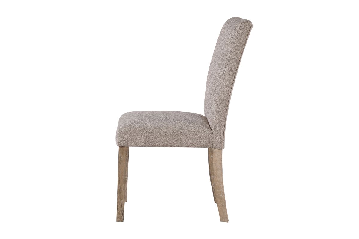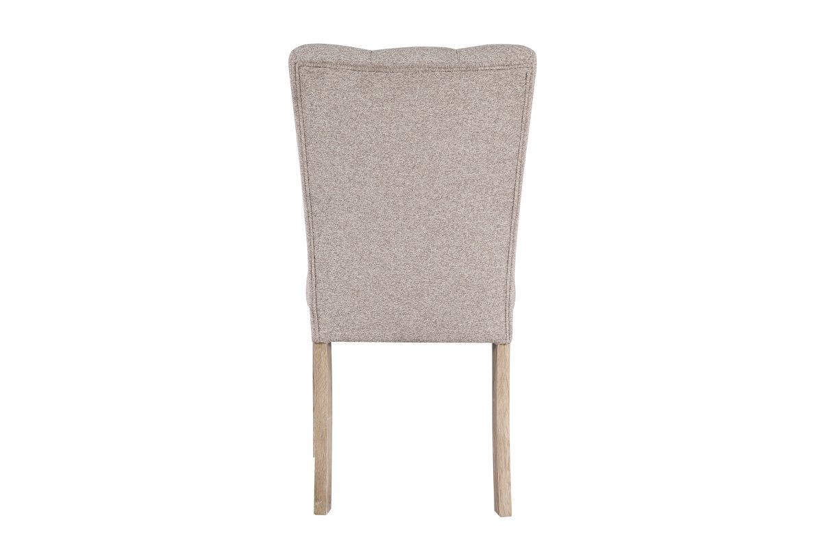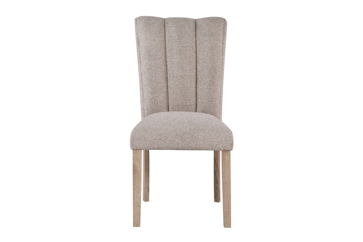 Introducing the Dani Dining Collection, which offers a white faux marble top design with an extra thick top and a large angle cut wood base. The beige upholstered chairs have a channel back and legs to match the table base.