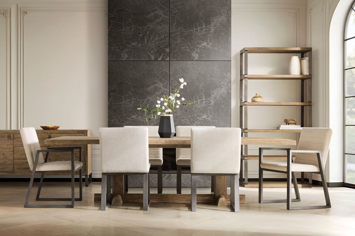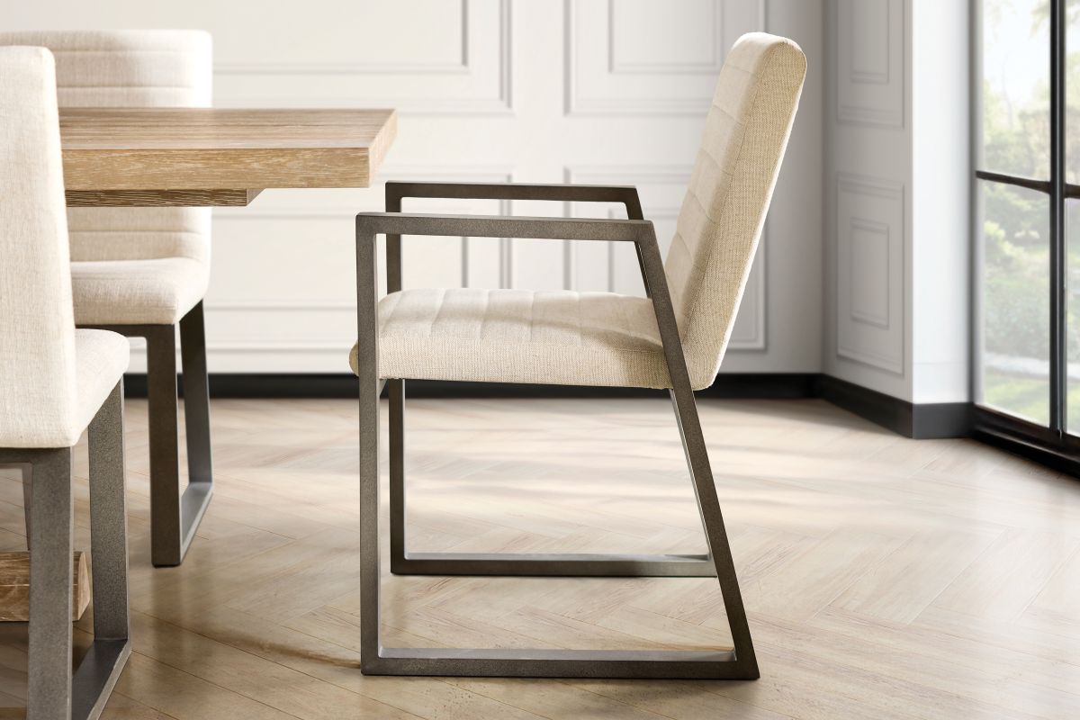 A traditional refectory table inspired the design of the Tribeca dining table. Shaped and tapered legs are joined by a stretcher and have rounded supports at the base. Clean lines and a rustic Aurum finish offer rich character and relaxed style. Clean lines and simple modern shapes combine for an urban design in the Tribeca side chair. A horizontal channeled seat is balanced on an angular frame in textured aluminum. The result is a chic and casual look for a contemporary style.