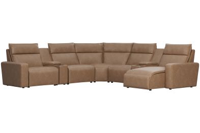 Discover the unlimited possibilities of the Modular Two dual power reclining sectional, thoughtfully designed with both comfort and flexibility in mind. Contemporary in style and upholstered in a plush suede-soft saddle colored microfiber, the sectional's tailored silhouette is enhanced by welted track arms and tufted back cushions for a look of refined elegance and serenity. Each piece is upholstered on all sides, offering endless opportunities for both reconfiguration as well as individual use. Dual power reclining functionality allows for easy adjustment in the headrest and footrest, providing the ultimate in personalized comfort. The consoles feature Bluetooth speaker connectivity, retracting cupholders and wireless charging. Select a preconfigured design or visit a showroom to learn about individual components and create the modular sectional perfect for your space and style.