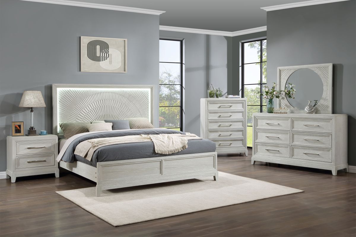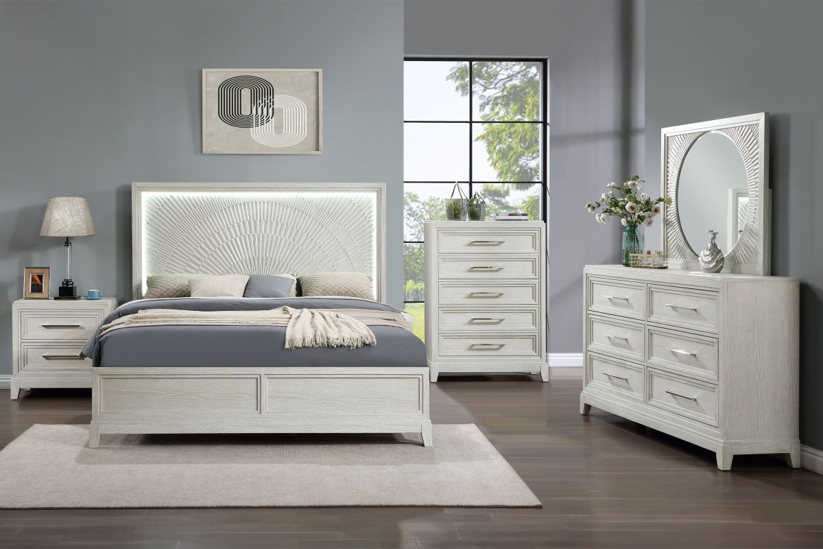 Transform your bedroom into a sanctuary of elegance and modern innovation with our Meredith Bedroom Collection, featuring a LED Lighted Headboard adorned with intricate wood carvings. Experience the perfect union of style, comfort, and technology for a truly luxurious sleeping space.