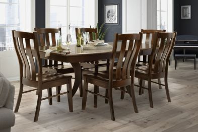 Made in Michigan, this seven piece Covina dining set will transform your dining setting. Crafted from solid Maple wood, this elegant set presents fine craftsmanship and accommodating transitional style complete with a Walnut Finish. It comes with a Pedestal Base and two 12" aproned self storing leaves that extends to 82" for larger gaterings of friends and family.