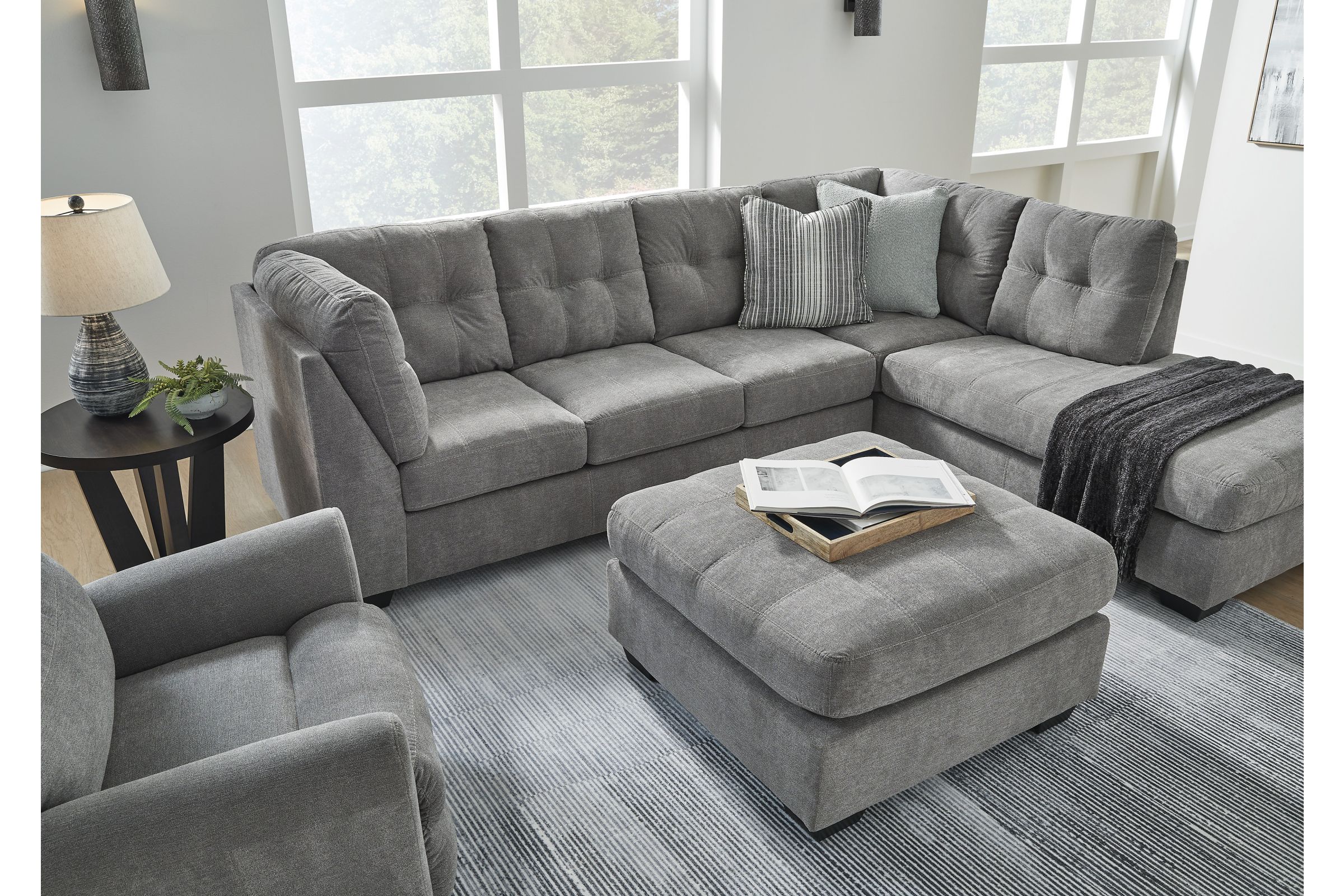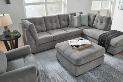 The Milo Grey 2-Piece Sectional with Right Arm Facing Chaise and Ottoman offers a stylish and comfortable seating solution for your living room. This contemporary sectional features a sleek grey upholstery that complements various interior designs. The right arm facing chaise provides ample space for relaxation, while the included ottoman adds versatility and extra seating options. Crafted with high-quality materials, the Milo Grey sectional ensures durability and long-lasting comfort.