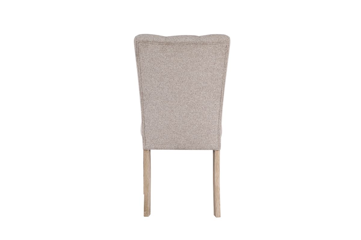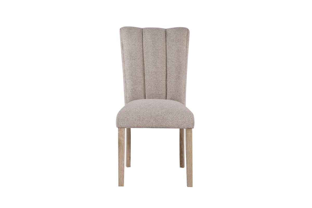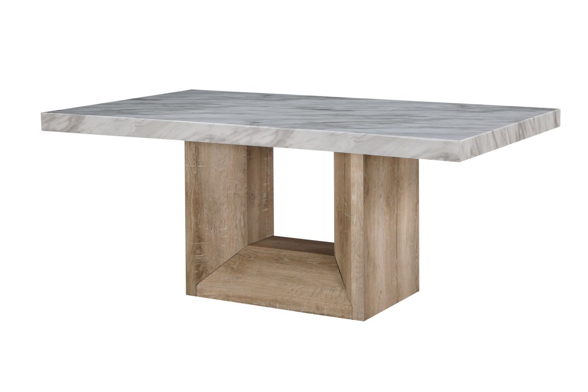 Introducing the Dani Dining Collection, which offers a white faux marble top design with an extra thick top and a large angle cut wood base. The beige upholstered chairs have a channel back and legs to match the table base.