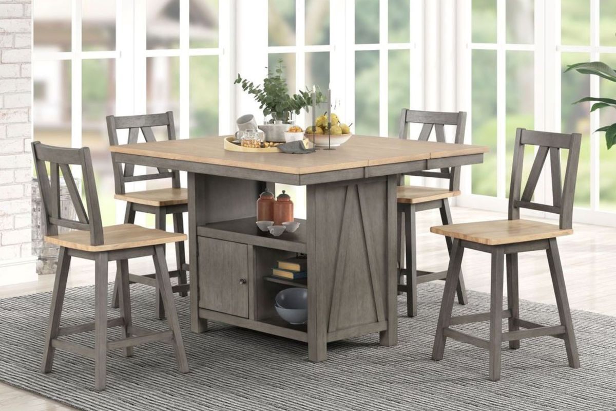 The Sherwood Five-piece counter table set is crafted of rubberwood solids and veneers, this set features a gray and sandstone finish and consists of the kitchen island table and four counter height swivel chairs. The table features an 15” Leaf and a storage base with two wood panel doors accented with wooden knob hardware with a shelf located behind them, a smaller open shelf, and a large open shelf for extra storage or display items. The end panels feature an inverted V shaped pattern. The counter height swivel chairs have the same inverted V pattern on the back, a saddle shaped swivel seat for added comfort, and nylon chair glides to protect your flooring.