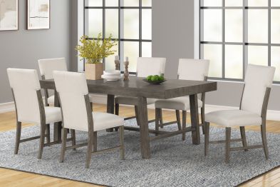 The Declan 5-Piece Dining Set makes rustic entertaining easy. Its rustic grey finish and earthy wood grain detail create an organic look. Make room for more family and friends with its 18" leaf, extending this table to 84" long. The versatile design of the Declan chair makes it suitable for various dining room styles. Whether your decor is traditional, modern, or somewhere in between, this chair adds a touch of elegance to any space.
