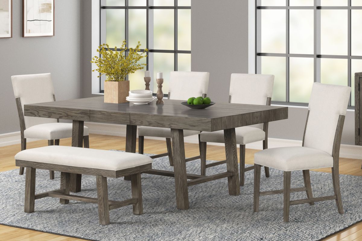 The Declan 6-Piece Dining Set makes rustic entertaining easy. Its rustic grey finish and earthy wood grain detail create an organic look. Make room for more family and friends with its 18" leaf, extending this table to 84" long. The versatile design of the Declan chair & bench makes it suitable for various dining room styles. Whether your decor is traditional, modern, or somewhere in between, this chair adds a touch of elegance to any space.
