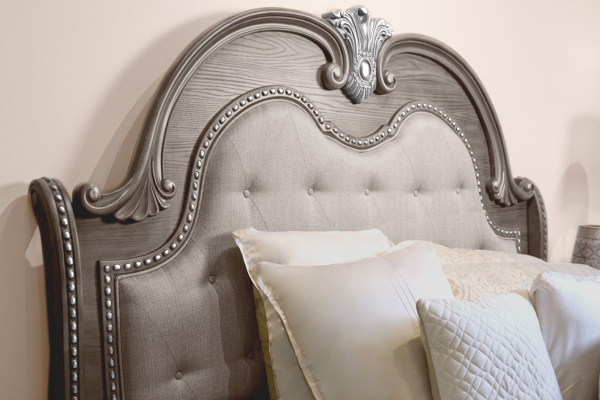 Revitalize your bedroom with our exquisite Opulence bedroom set, featuring marble inlay tops on the dresser and chest, along with an upholstered headboard adorned with decorative scrolling. This set combines elegance and sophistication, creating a luxurious sanctuary in your home.