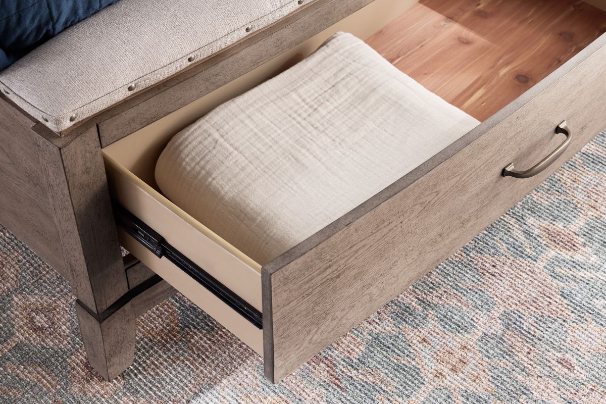 The Townsend collection is full of soft lines and curves tied together with a signature, burnished beige finish, and storage footboard with upholstered bench seat, this collection is suitable for room schemes from rustic to traditional.