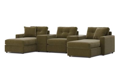 Discover the limitless possibilities of the Modular One sectional, thoughtfully designed with comfort and flexibility in mind. This customizable seating solution features individual pieces that can be reconfigured to the shape you need. Game days, movie nights, sleepovers, and everyday relaxation are all better when the seating arrangement you want is always right at your fingertips. This soft, green chenille includes Repreve yarn, made with recycled plastic bottles. The open seating includes a chaise and has welted track arms, top-stitched seat cushions and button-tufted back cushions for an elegant silhouette. Consoles provide hidden storage, USB charging ports, wireless charging, Bluetooth speakers, and double as side tables with sleek acrylic tops.