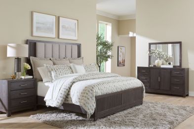 The sophisticated Naomi bed, has a chenille channel grey fabric headboard. This set blends casual and contemporary style, providing a perfect balance of comfort and elegance for your bedroom.