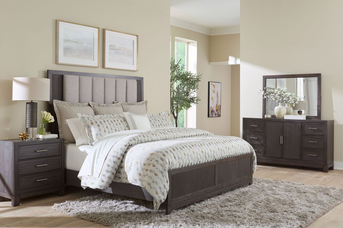 The sophisticated Naomi bedroom set, featuring satin wash bar pull hardware and a grey chenille channel fabric headboard. This set blends casual and contemporary style, providing a perfect balance of comfort and elegance for your bedroom.