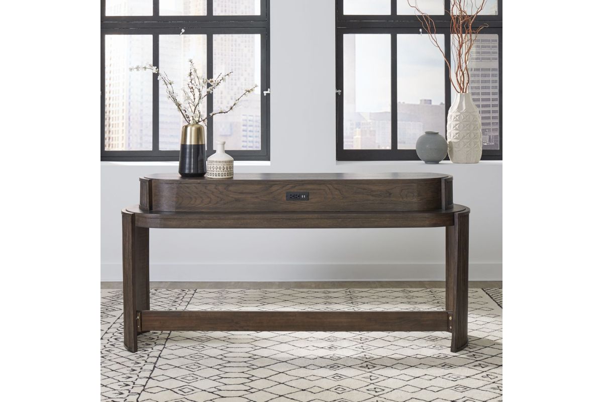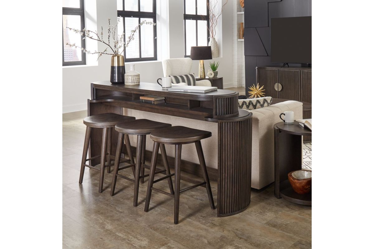 With its sleek lines and modern design, the City View 4 piece set is a statement of impeccable taste and refined sophistication. Crafted with excellence using Rubberwood solids and Quartered White Oak veneers, this set features a Coffee Bean finish and includes the console bar table and 3 console stools. At the heart of the console bar table lies its modern silhouette, characterized by softly curved reeded end panels that exude elegance and refinement. These subtle details lend a sense of texture and visual interest to the table, creating a focal point that effortlessly complements any interior aesthetic. But it's the practical features that truly set this console bar table apart. Small storage compartments underneath the top provide the perfect spot to store remote controls, keeping them within easy reach yet neatly organized. But the true genius of this table lies in its built-in charging station, which ensures that your devices are always powered up and ready to go. With two AC outlets, one USB-A port, and one USB-C port, you can charge multiple devices simultaneously, whether it's your smartphone, tablet, or laptop. The scooped wooden seat of the console stools, and the round tapered legs that flow to the footrest for added comfort, provide ergonomic support for long periods of sitting. Perfect for placing behind the sofa, the City View 4 piece set transforms any seating area into a multifunctional space where you can enjoy a meal, catch up on work, or simply unwind while watching your favorite TV show or movie. Its sleek design and practical features make it an indispensable addition to any home, offering both style and convenience in equal measure.