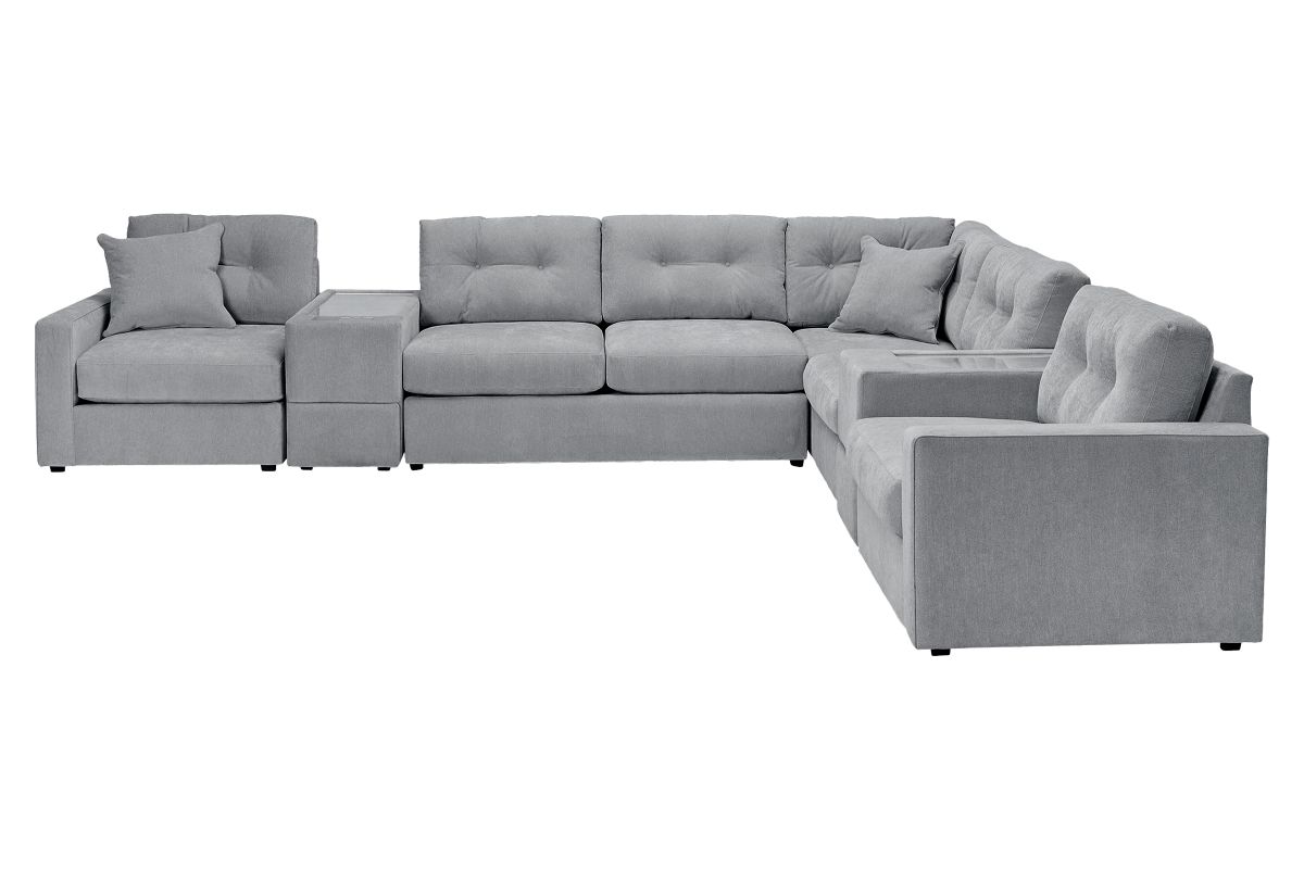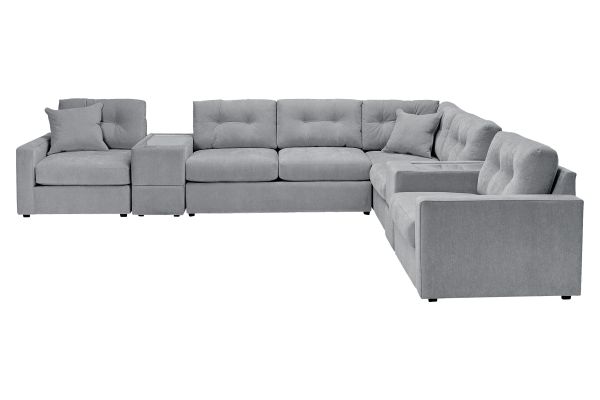 Discover the limitless possibilities of the ModularOne sectional, thoughtfully designed with comfort and flexibility in mind. This customizable seating solution features individual pieces that can be reconfigured to the shape you need. Game days, movie nights, sleepovers, and everyday relaxation are all better when the seating arrangement you want is always right at your fingertips. This soft, grey chenille includes Repreve yarn, made with recycled plastic bottles. The dual seating area has welted track arms, top-stitched seat cushions and button-tufted back cushions for an elegant silhouette. The armless loveseat component features a full size 4" innerspring mattress, perfect for over night guests and easily hidden away for gameday. Consoles provide hidden storage, USB charging ports, wireless charging, Bluetooth speakers, and double as side tables with sleek acrylic tops.