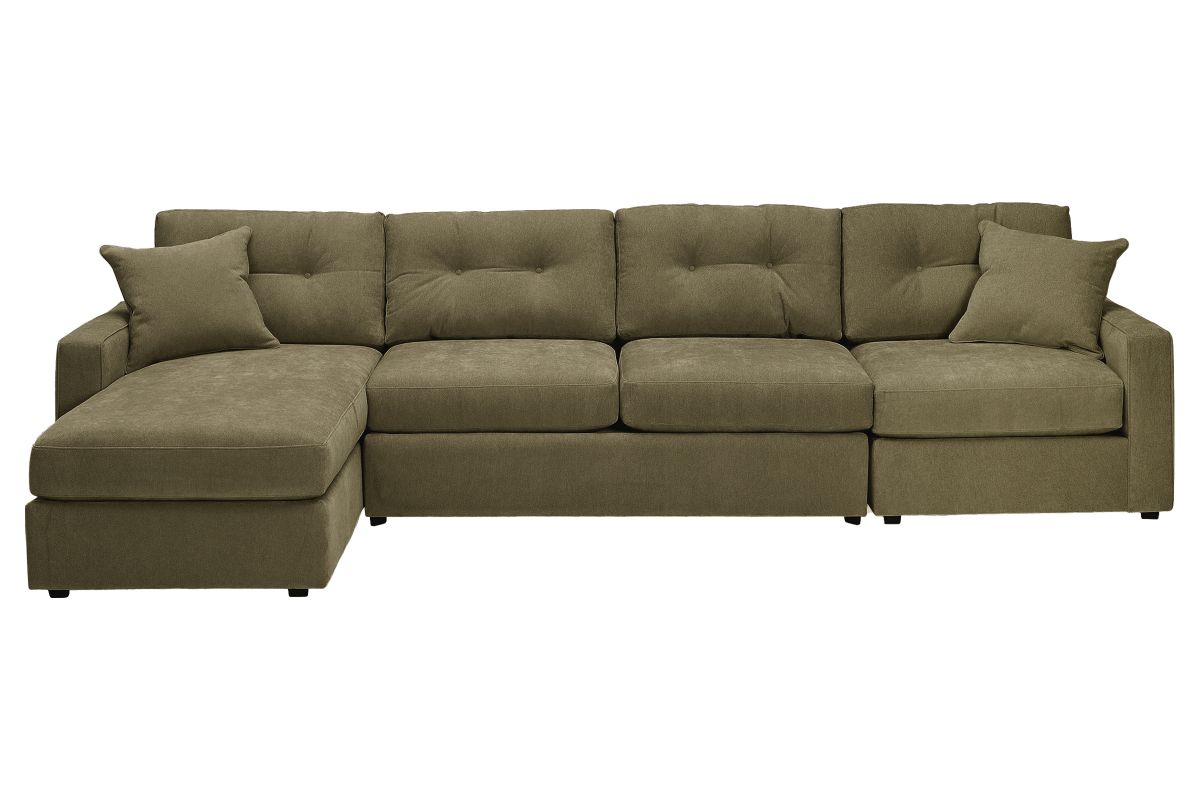Discover the limitless possibilities of the ModularOne sectional, thoughtfully designed with comfort and flexibility in mind. This customizable seating solution features individual pieces that can be reconfigured to the shape you need. Game days, movie nights, sleepovers, and everyday relaxation are all better when the seating arrangement you want is always right at your fingertips. This soft, beige chenille includes Repreve yarn, made with recycled plastic bottles. The dual seating area has welted track arms, top-stitched seat cushions and button-tufted back cushions for an elegant silhouette. The armless loveseat component features a full size 4" innerspring mattress, perfect for over night guests and easily hidden away for gameday.