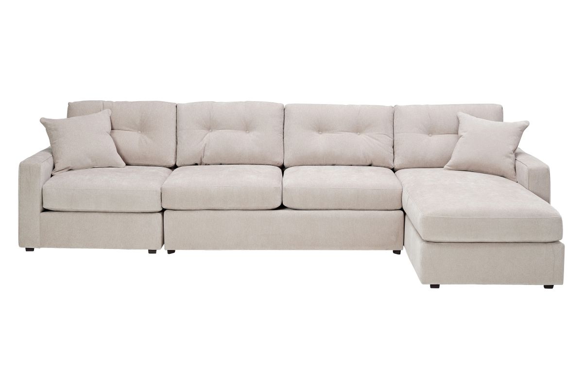 Discover the limitless possibilities of the ModularOne sectional, thoughtfully designed with comfort and flexibility in mind. This customizable seating solution features individual pieces that can be reconfigured to the shape you need. Game days, movie nights, sleepovers, and everyday relaxation are all better when the seating arrangement you want is always right at your fingertips. This soft, beige chenille includes Repreve yarn, made with recycled plastic bottles. The dual seating area has welted track arms, top-stitched seat cushions and button-tufted back cushions for an elegant silhouette. The armless loveseat component features a full size 4" innerspring mattress, perfect for over night guests and easily hidden away for gameday.