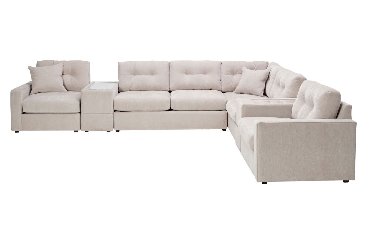 Discover the limitless possibilities of the ModularOne sectional, thoughtfully designed with comfort and flexibility in mind. This customizable seating solution features individual pieces that can be reconfigured to the shape you need. Game days, movie nights, sleepovers, and everyday relaxation are all better when the seating arrangement you want is always right at your fingertips. This soft, beige chenille includes Repreve yarn, made with recycled plastic bottles. The dual seating area has welted track arms, top-stitched seat cushions and button-tufted back cushions for an elegant silhouette. The armless loveseat component features a full size 4" innerspring mattress, perfect for over night guests and easily hidden away for gameday. Consoles provide hidden storage, USB charging ports, wireless charging, Bluetooth speakers, and double as side tables with sleek acrylic tops.
