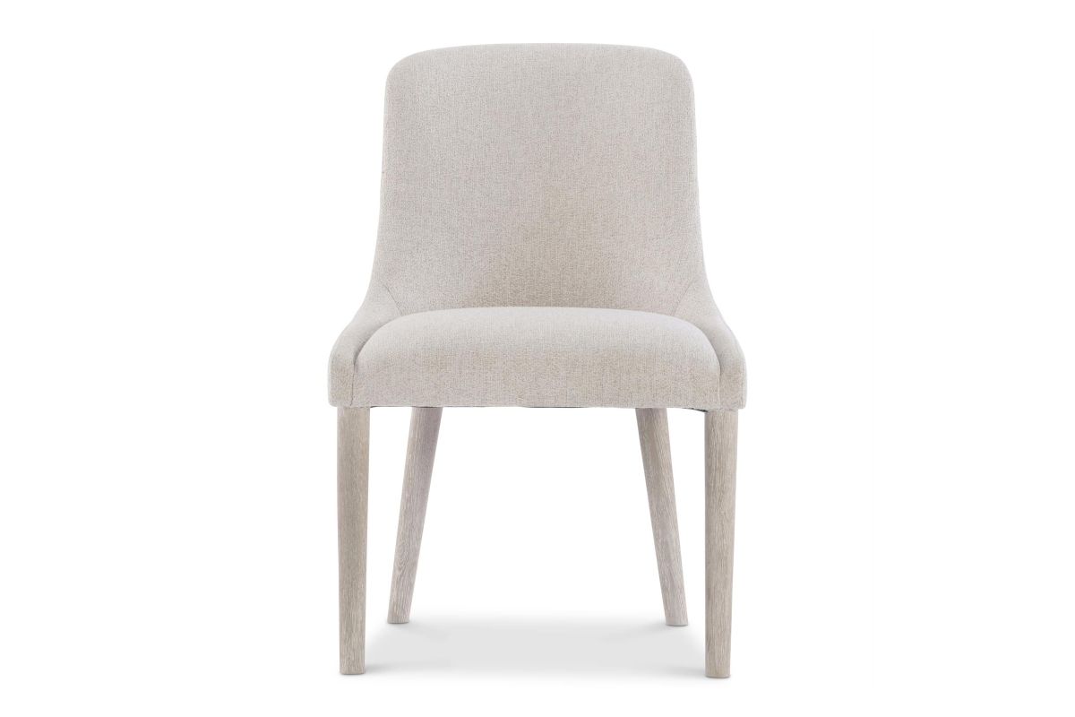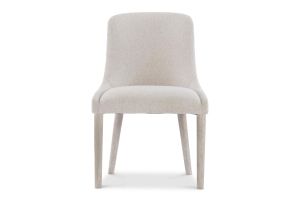 - Fully upholstered seat and back with exposed wood legs in Roz finish