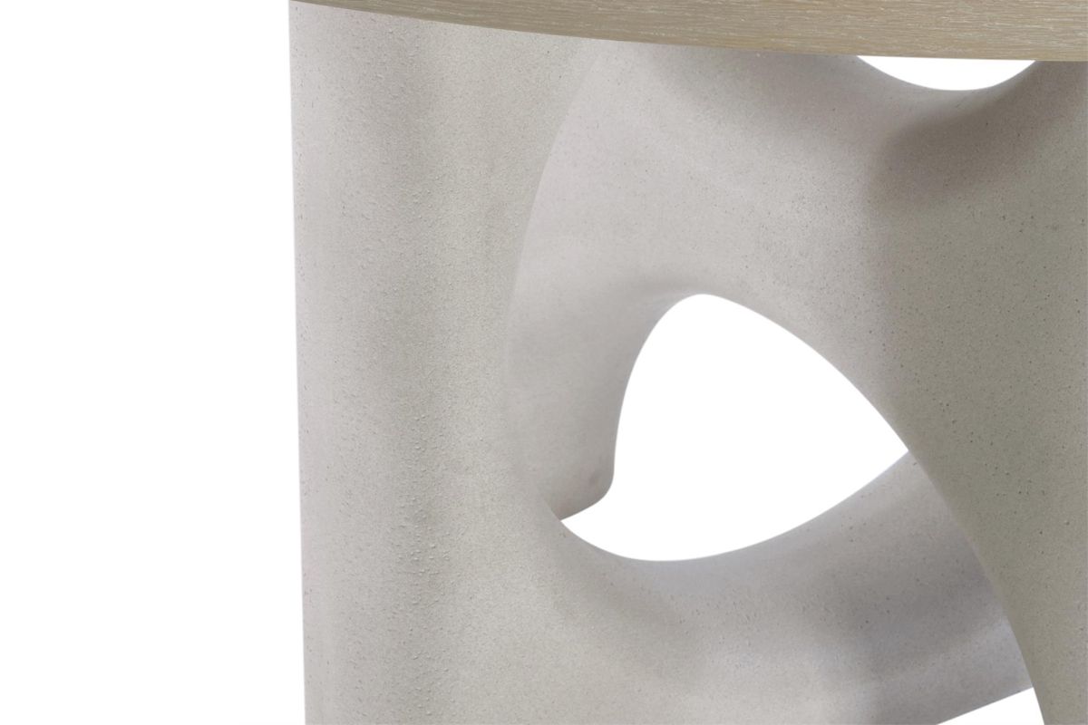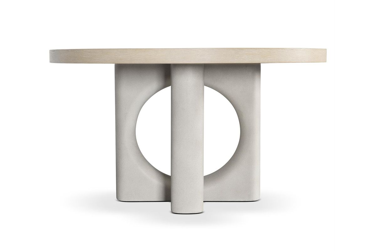 An interlocking sculptural base makes an artistic statement on the Antibes dining table. Bisecting circles and curves are crafted from a textural glass-reinforced concrete in Pumice finish. The base contrasts beautifully with a round wood top in the rustic Roz finish.The rounded back on the Antibes side chair curves its way down to form low-profile arms. The serenely modern design is complemented with round exposed wood legs in the Roz finish. It's a look that's both organic and elemental, fitting many dining room styles.